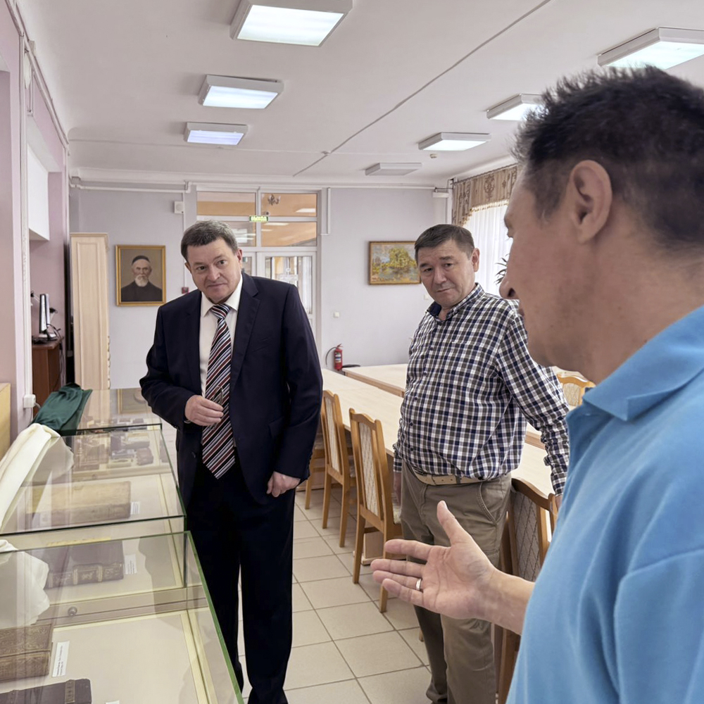 Аркадия Брызгалина в отделе рукописей и редких изданий была организована увлекательная обзорная экскурсия. Заведующий отделом, кандидат филологических наук, доцент Флюр Сибагатов ознакомил гостя самым ранним печатным изданием в фондах библиотеки – книгой «Богословие четырех книг Дамаскина с комментариями и разъяснениями» Иоанна Дамаскина (Париж, 1512, на латинском языке), а также богатейшей коллекцией книг Дашковых. Среди уникальных книги с автографами поэтов Гавриила Державина и Василия Жуковского, героя Отечественной войны 1812 года Дениса Давыдова и др., внимание Аркадия Викторовича привлекли и прижизненные издания классиков русской литературы, ученых и политиков (С.Т. Аксаков, К.М. Батюшков, М.В. Ломоносов, Л.Н. Толстой, И.С. Тургенев, М.Н. Загоскин, Н.Карамзин, Д.Я. Дашков, П.И. Рычков, П.С. Паллас, Ф.М. Достоевский, В.В. Маяковский и др.).