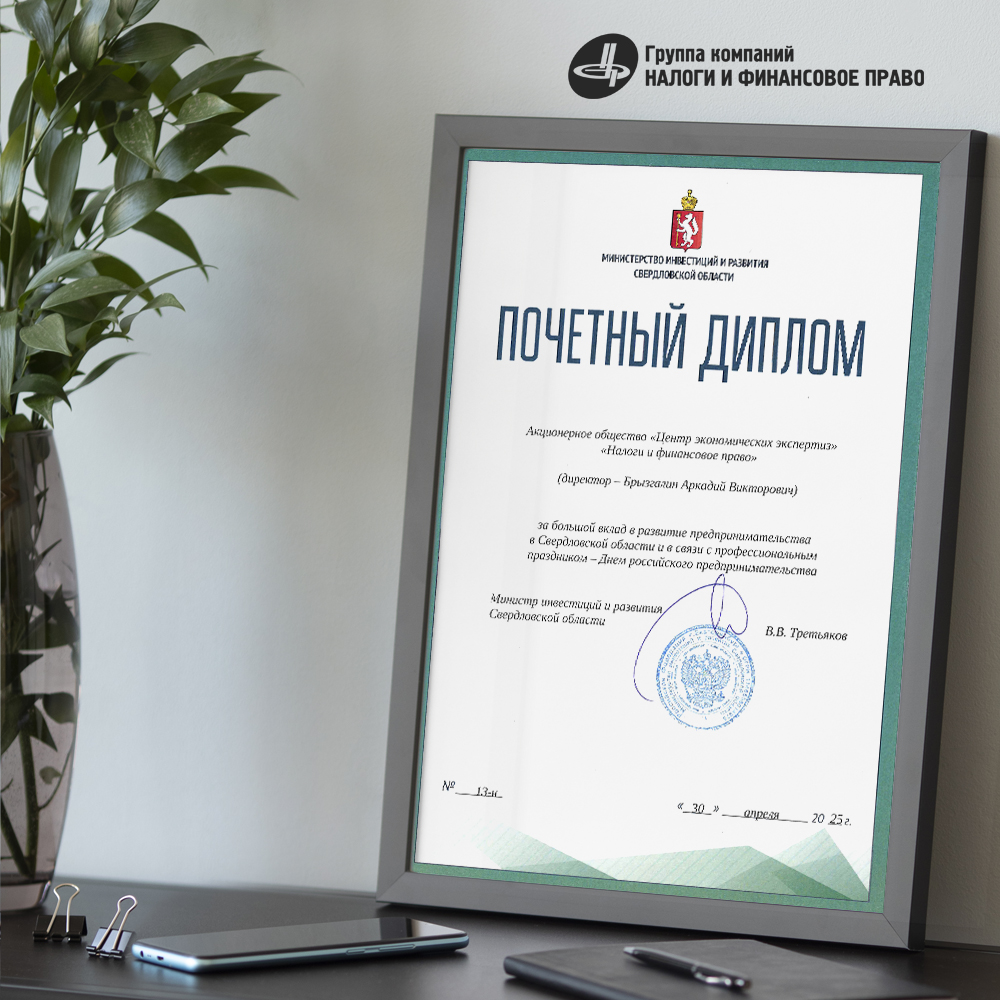 В первых числах июля руководителю АО «Центр экономических экспертиз «Налоги и финансовое право» Аркадию Викторовичу Брызгалину был вручен Почетный Диплом Министерства инвестиций и развития Свердловской области за большой вклад в развитие предпринимательства в Свердловской области.