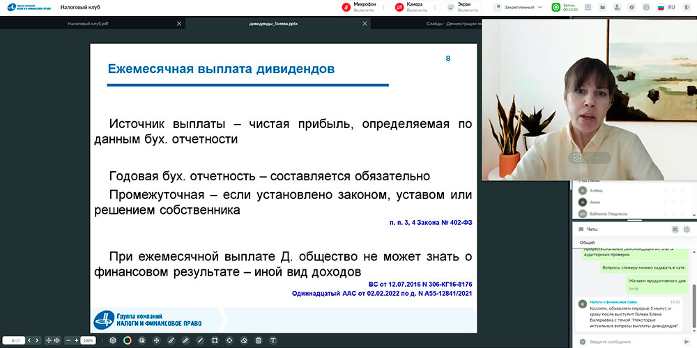 Следующее выступление было посвящено теме выплаты дивидендов. Ведущий специалист по юридическим вопросам ГК «Налоги и финансовое право» Голева Елена Валерьевна рассмотрела самые актуальные вопросы и поделилась свежей практикой.