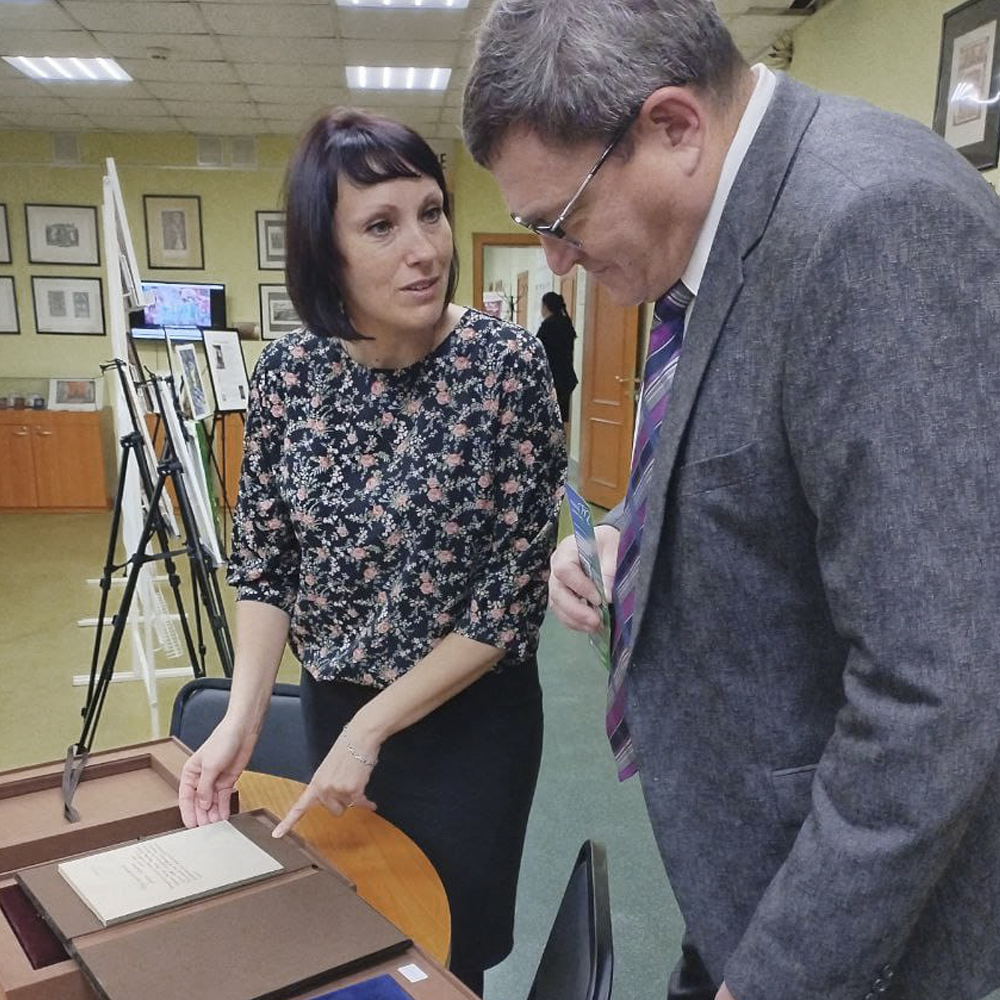 Затем ведущий библиотекарь, Юлия Шмакова познакомила гостя библиотеки с уникальными книгами фонда «Возрождение Тобольска». Вниманию Аркадия Викторовича были представлены редкие книги. Особый интерес вызвали: факсимильное издание «Евангелие Ф. М. Достоевского», факсимиле авторской рукописи сказки «Конёк – Горбунок» П. П. Ершова, репринтное издание «Чертежной книги Сибири», созданная в 1701 г. тобольским исследователем Сибири Семеном Ремезовым.