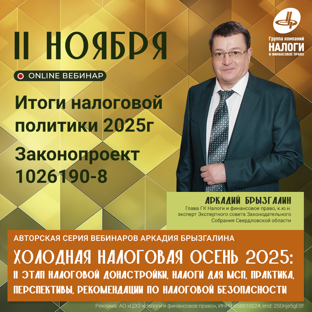 Завтра, 11 ноября, стартует осенняя серия авторских вебинаров А.В. Брызгалина: «Холодная налоговая осень 2025 года»: Второй этап «налоговой донастройки», жёсткие налоги для МСП, практика, перспективы, рекомендации по налоговой безопасности.