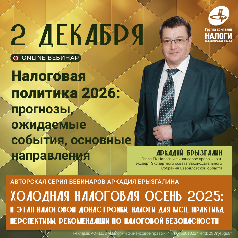 АНОНС четвертого дня осенней серии авторских вебинаров А.В. Брызгалина: «Холодная налоговая осень 2025 года»: Второй этап «налоговой донастройки», жёсткие налоги для МСП, практика, перспективы, рекомендации по налоговой безопасности