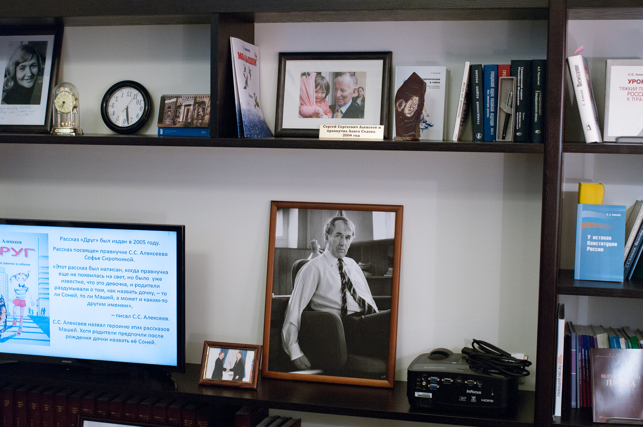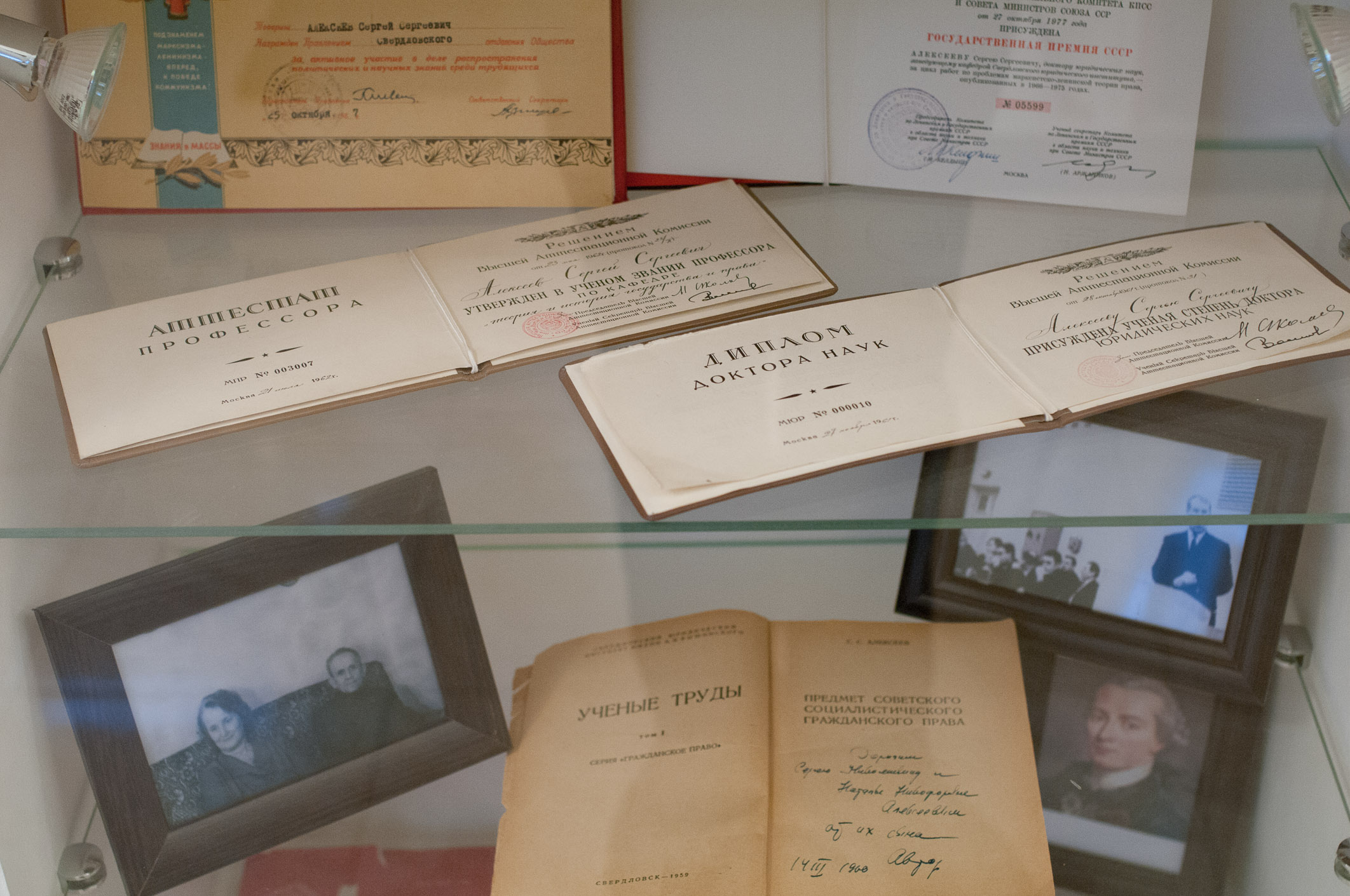 Сергей Сергеевич Алексеев — основоположник уральской научной школы теории государства и права, автор более 400 печатных трудов, в том числе, 60 монографий. Долгое время он возглавлял кафедру теории права в Свердловском юридическом институте, потом, став депутатом Верховного Совета СССР и переехав Москву, возглавил первый в нашей стране прообраз конституционного суда страны – Комитет конституционного надзора. РедактироватьПосле возвращения в Екатеринбург Сергей Сергеевич работа в Школе частного права на улице Ленина, где сейчас и открыт музей, в котором собраны его личные вещи, книги.