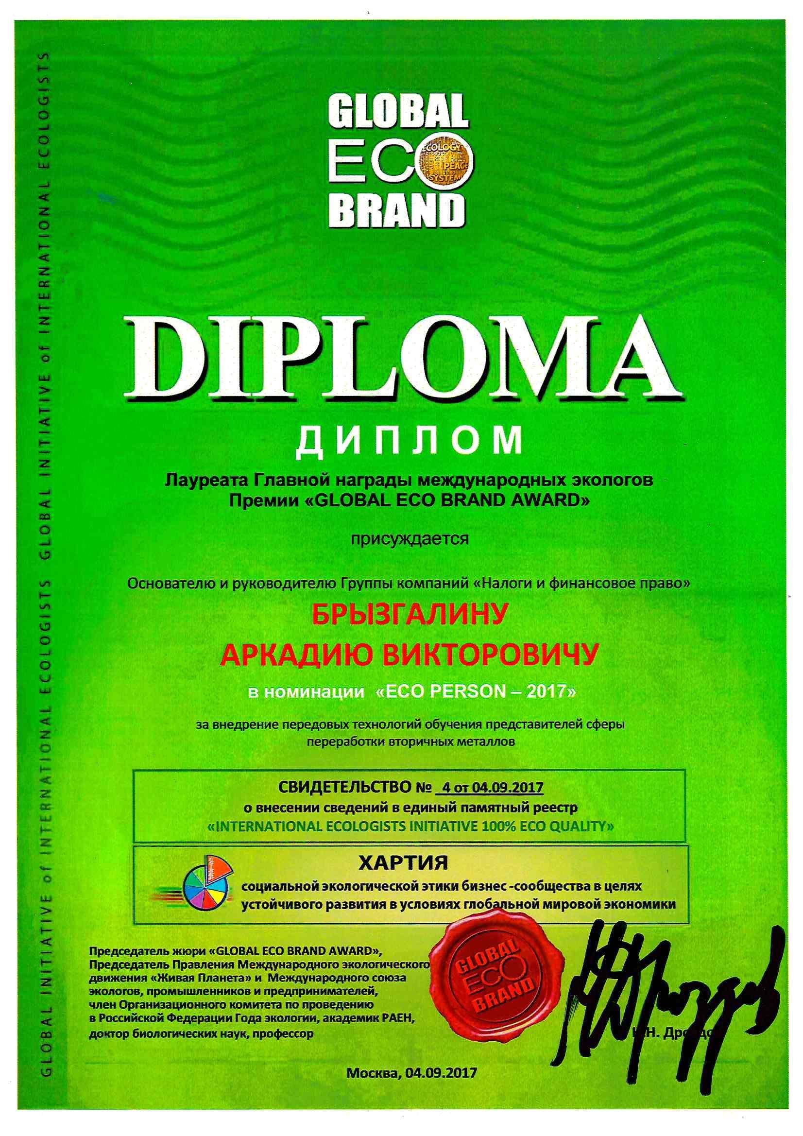 Группа компаний "Налоги и финансовое право" занимается не только вопросами налогообложения, но и вопросами, касающимися экологического законодательства. Так Николай Николаевич Дроздов поздравил с успехами на экологическом поприще Аркадия Викторовича Брызгалина и лично вручил ему диплом лауреата Главной награды международных экологов премии «Global Eco Brand Award» в номинации «ECO PERSON – 2017» за внедрение передовых технологий обучения представителей сферы переработки вторичных материалов.