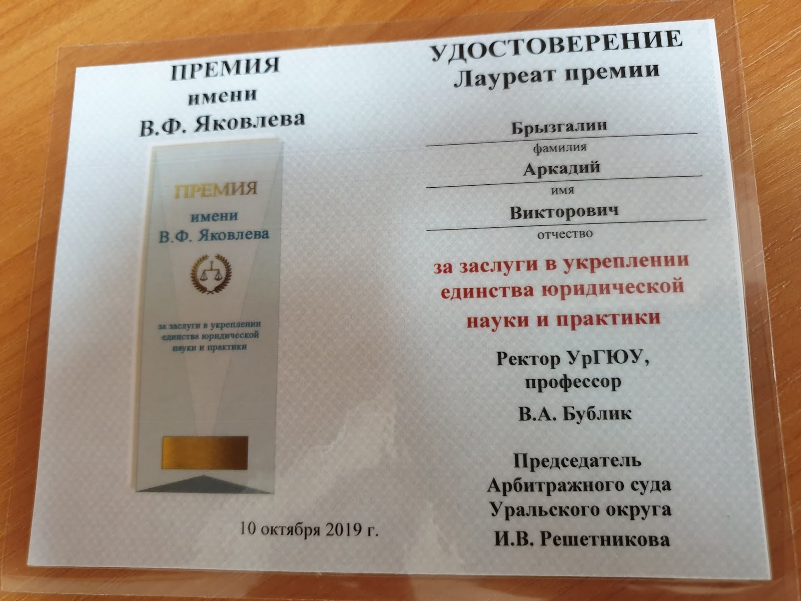 В сентябре этого года Арбитражный суд Уральского округа и Уральский государственный юридический университет учредили премию имени выдающегося российского юриста и нашего земляка Вениамина Яковлева.