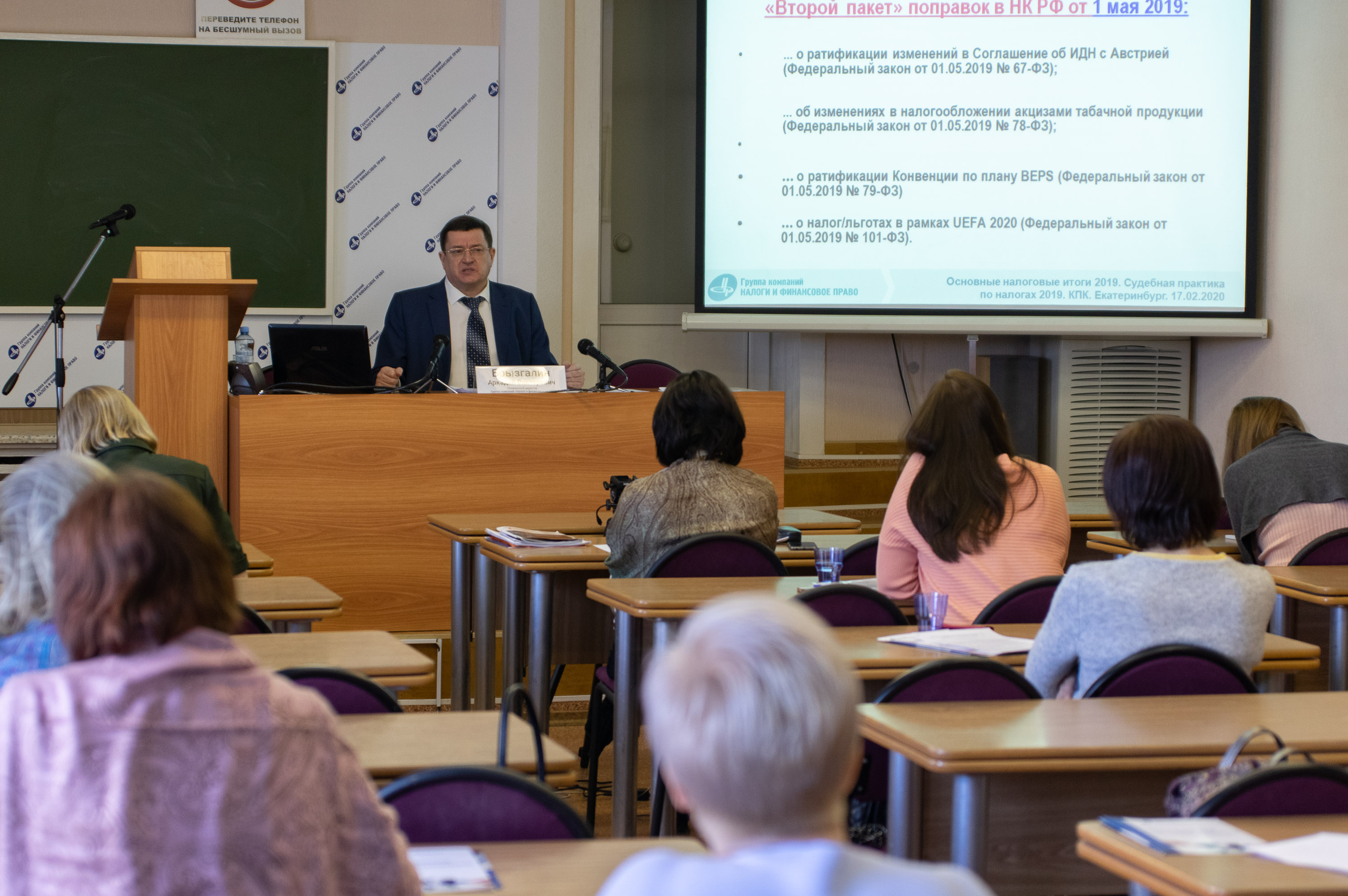 После небольшого вступления и лекции об Основных налоговых итогах 2019 года Аркадий Викторович Брызгалин прочёл доклад о Самой значимой арбитражной практике Верховного суда по налоговым спорам в 2019 году: основных событиях, важнейших прецедентах Верховного Суда РФ, самых громких налоговых делах.