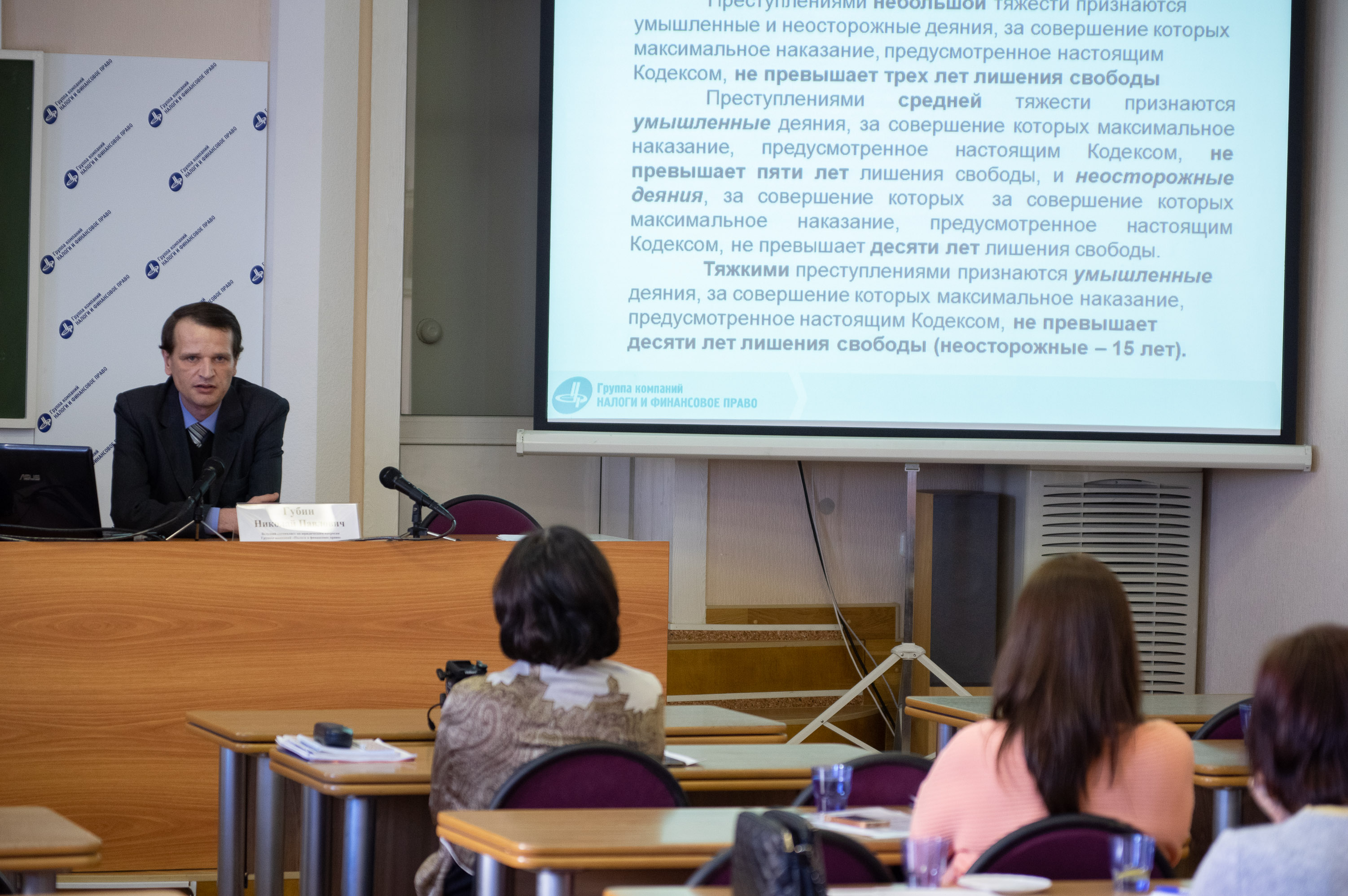 Тему продолжил Николай Павлович Губин, главный специалист по юридическим вопросам с лекцией об Общих положениях об уголовной ответственности за совершение налоговых преступлений (составы, сроки давности, основания для освобождения) с учетом позиций Пленума ВС РФ.