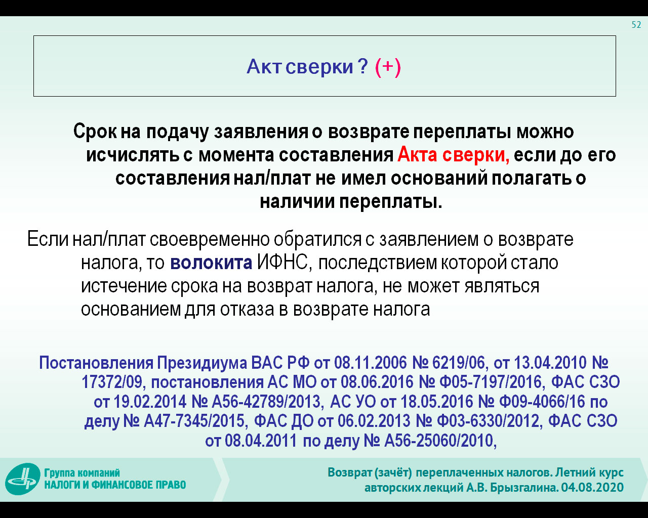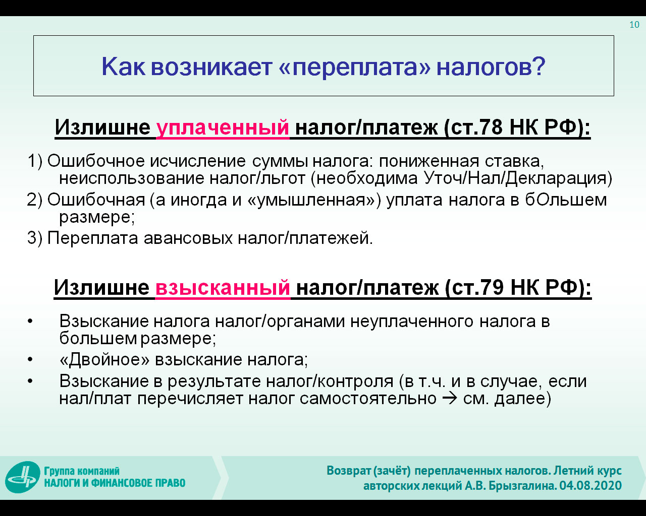 На протяжении двух часов мы говорили о самых важных и интересных вопросах возврата (зачёта) налогов и связанных аспектов. Подробно осветили как историю вопроса (принятие и развитие российской налоговой системой института зачёта налогов, так и процедурные вопросы возвращения переплаченных налоговых платежей.