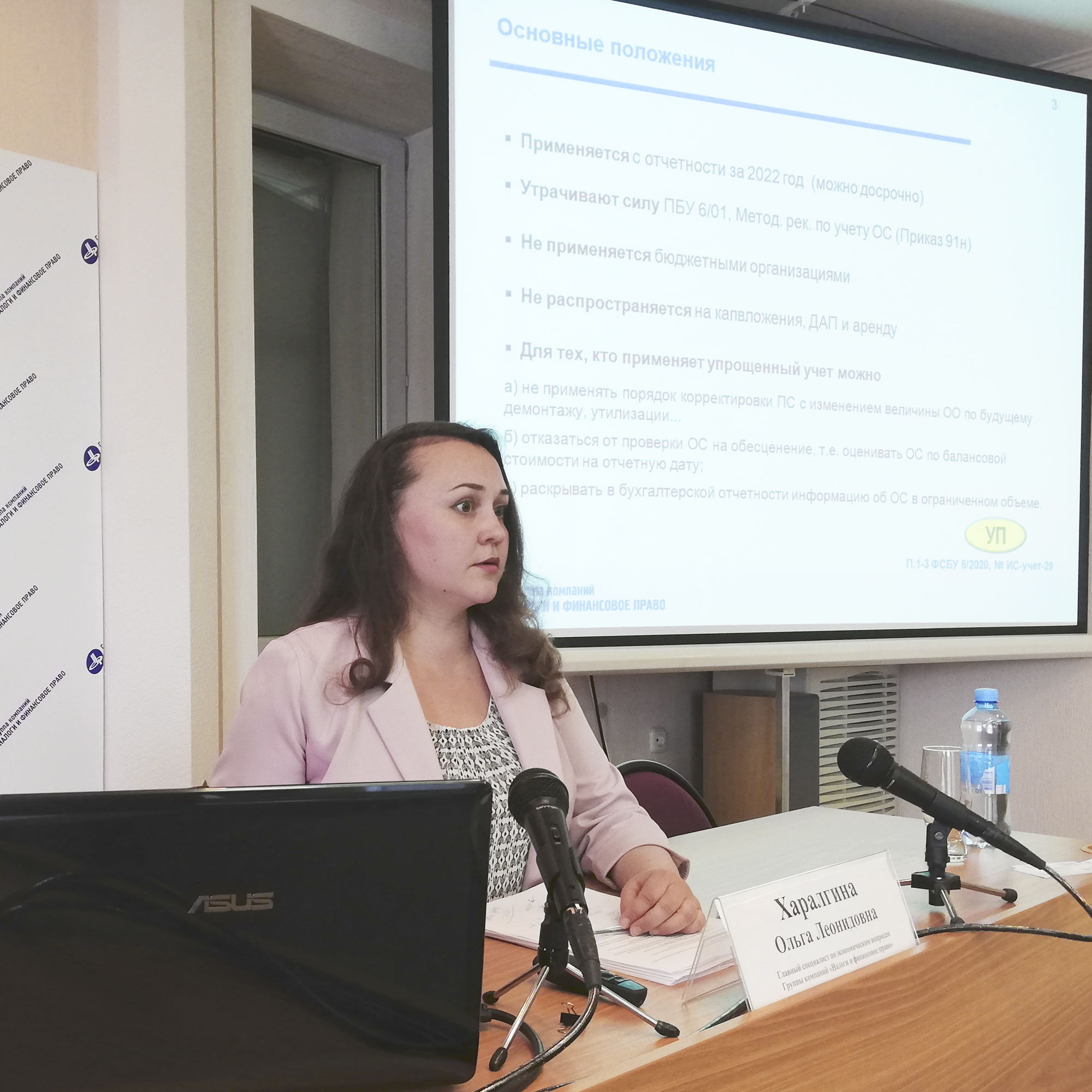 Доклад спикера следующего блока, главного специалиста Центра «Налоги и финансовое право» по экономическим вопросам Ольги Харалгиной был посвящен двум темам: переход на новые правила учета ФСБУ 6 «Основные средства» и ФСБУ 26 «Капитальные вложения».