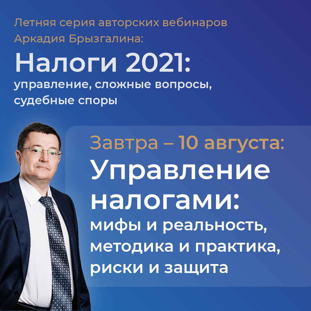Сегодня 9 августа – второй понедельник августа. Это означает, что уже завтра пройдет одна из интереснейших лекций летней серии авторских вебинаров Аркадия Брызгалина: Налоги 2021: управление, сложные вопросы, судебные споры, в ходе которой мы углубимся в тему управления налогами.