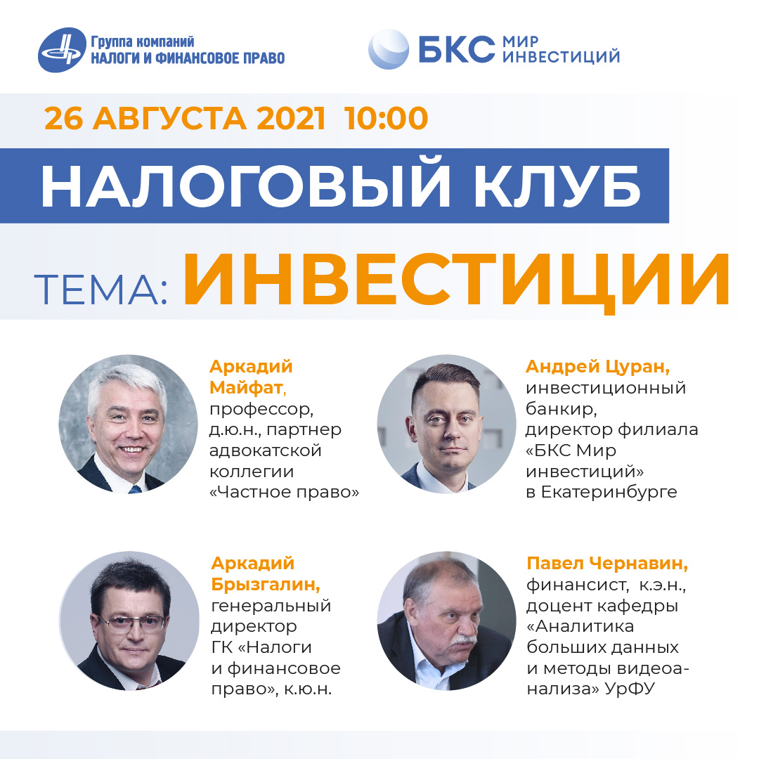 26 августа в рамках Налогового клуба в Екатеринбурге пройдет не совсем обычное заседание. Мы будем говорить обо всем, что касается инвестиций. От правового регулирования и налогового стимулирования, до грамотной диверсификации активов и влияния искусственного интеллекта на инвестирование в высокотехнологичный сектор.