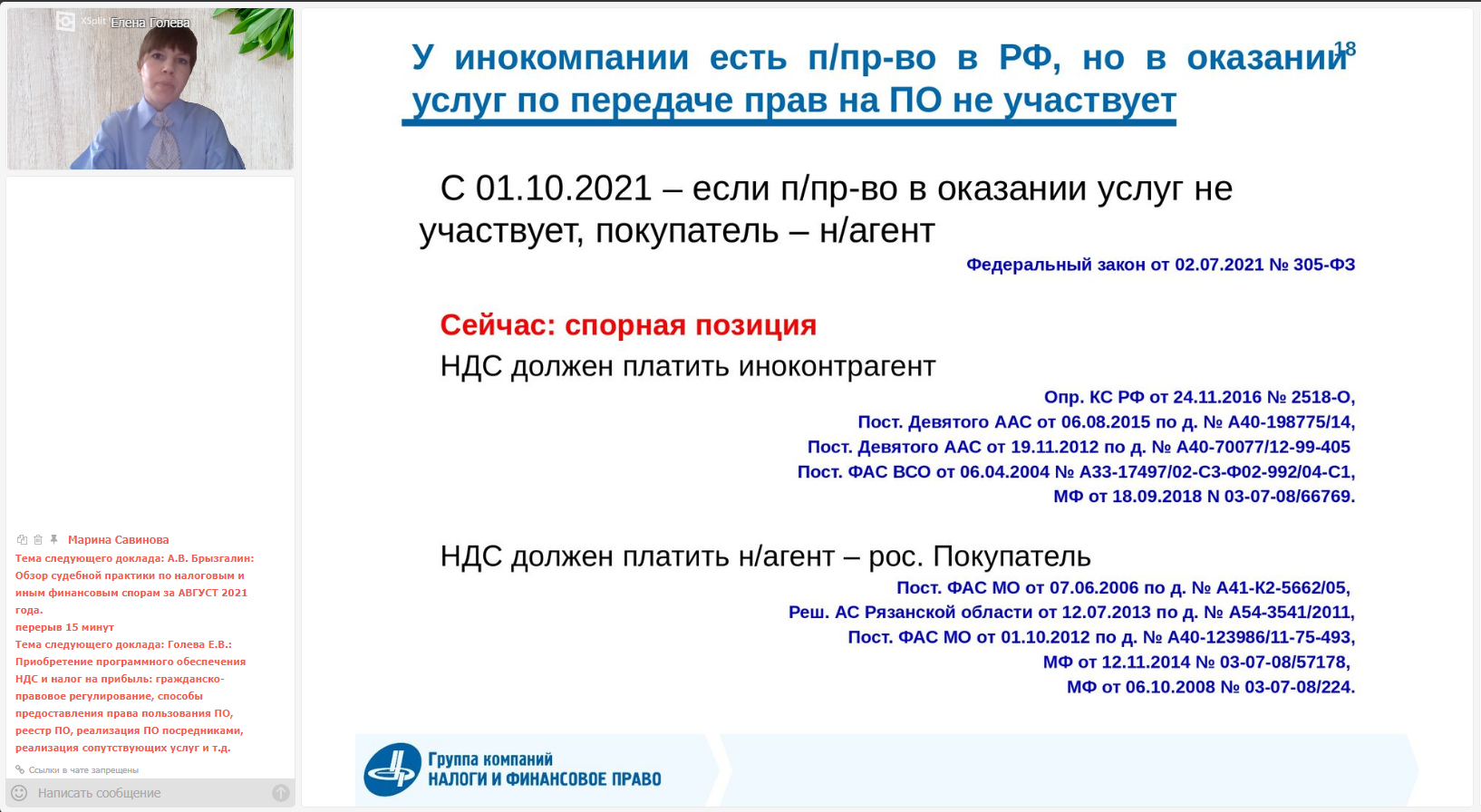 После чего Аркадий Викторович сделал обзор судебной практики по налоговым и иным финансовым спорам за август текущего года и передал слово ведущему специалисту Группы Компаний «Налоги и финансовое право» по юридическим вопросам Елене Голевой. В своем выступлении Елена Валерьевна сделала акцент на гражданско-правовом регулировании приобретения программного обеспечения (ПО), способах предоставления права пользования ПО, реестре ПО. Остановилась на тонких момента, которые могут возникнуть при реализация ПО посредниками, а также при реализация сопутствующих услуг.