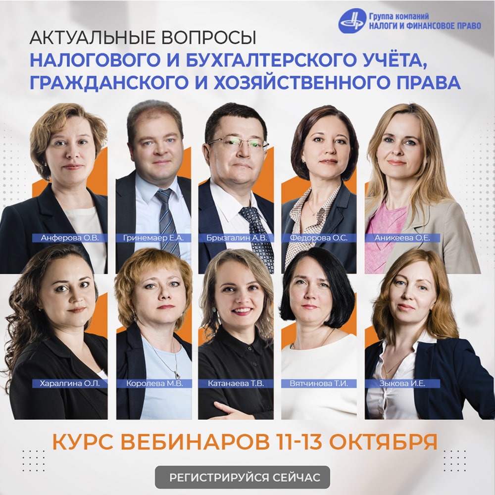С 11 по 13 октября ГК «Налоги и финансовое право» проводит курс вебинаров «Актуальные вопросы налогового и бухгалтерского учета, гражданского и хозяйственного права» по самым актуальным и передовым темам современного законодательства.