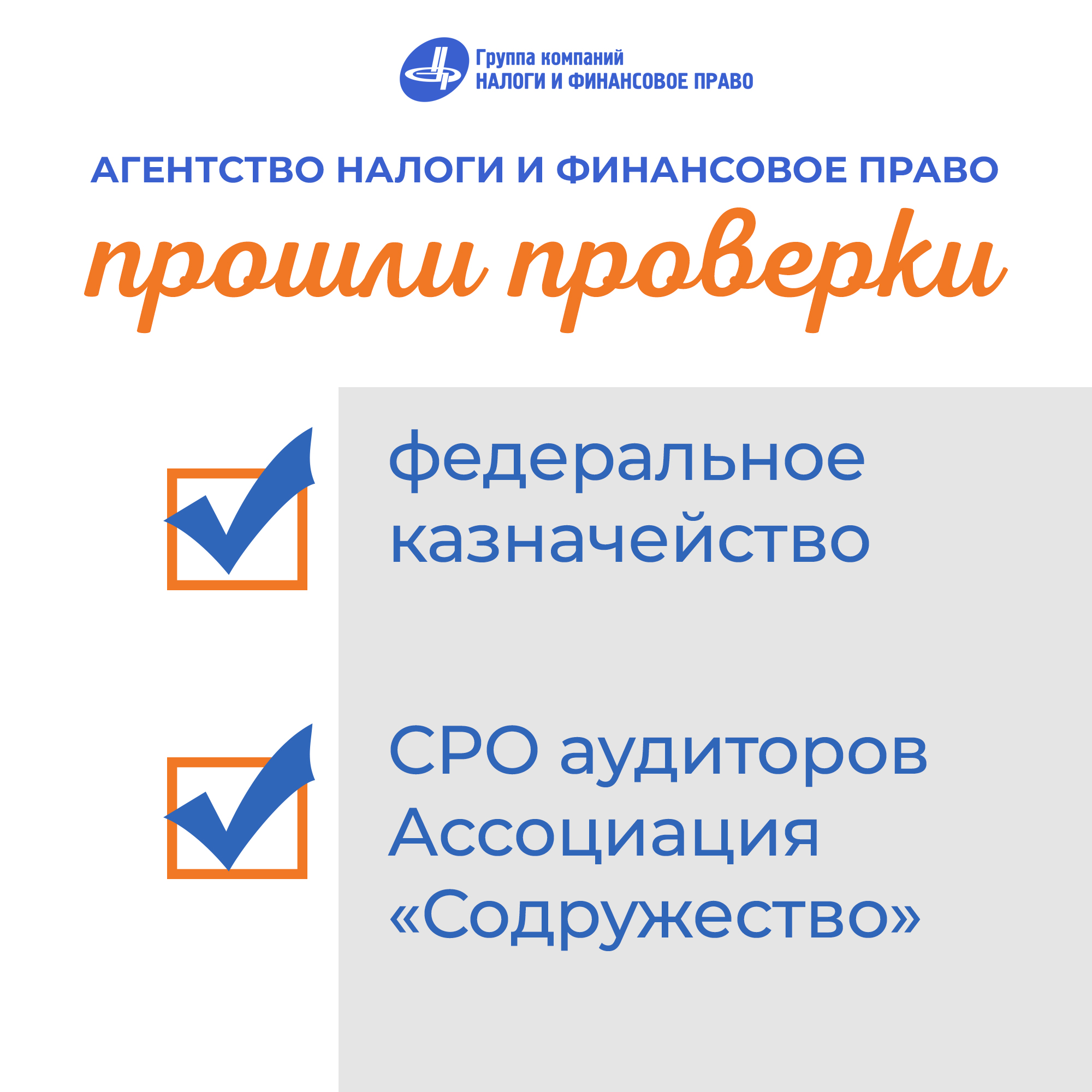 Агентством «Налоги и финансовое право» успешно пройдены проверки Федерального Казначейства России и СРО «Содружество»