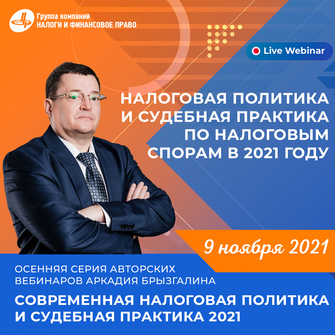 В ближайший вторник - 9 ноября стартует осенняя серия авторских вебинаров Аркадия Брызгалина Современная налоговая политика и судебная практика 2021 года.В 10.00 по московскому времени мы начнем нашу серию с темы Налоговая политика 2021 г.: итоги и перспективы.