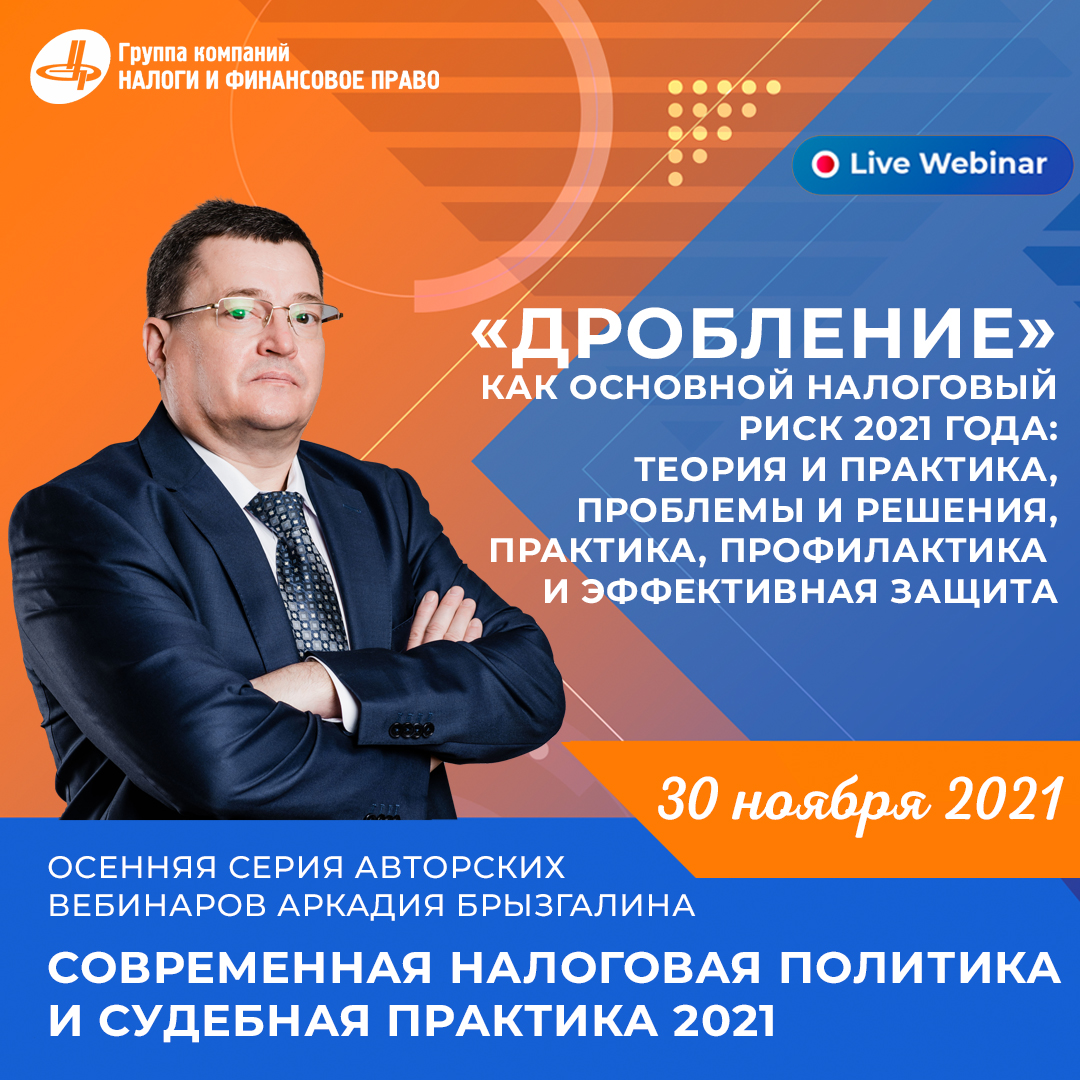 Ноябрь пролетел незаметно. В последний день уходящей осени Аркадий Викторович Брызгалин и команда экспертов из ГК «Налоги и финансовое право» проведут заключительный вебинар серии: «Дробление» как основной налоговый риск 2021 года: теория и практика, проблемы и решения, практика, профилактика и эффективная защита.Вебинар содержит 2 блока. Продолжительность - 4 часа.