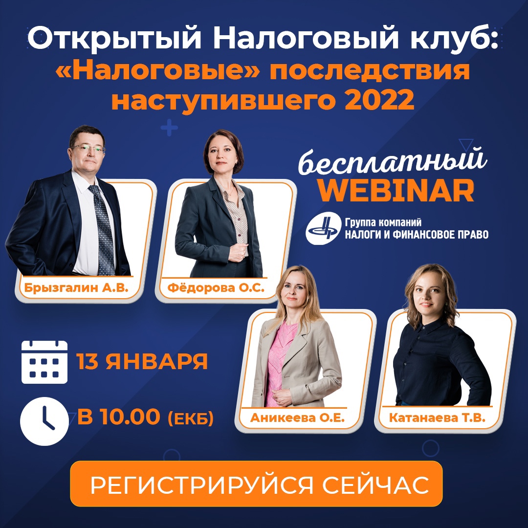 Друзья, по нашей давней традиции, самое первое в новом году заседание Налогового клуба мы посвящаем «Налоговым» последствиям наступившего 2022 г., проводим абсолютно БЕСПЛАТНО и для всех желающих. Условия лишь одно - необходима предварительная регистрация!|