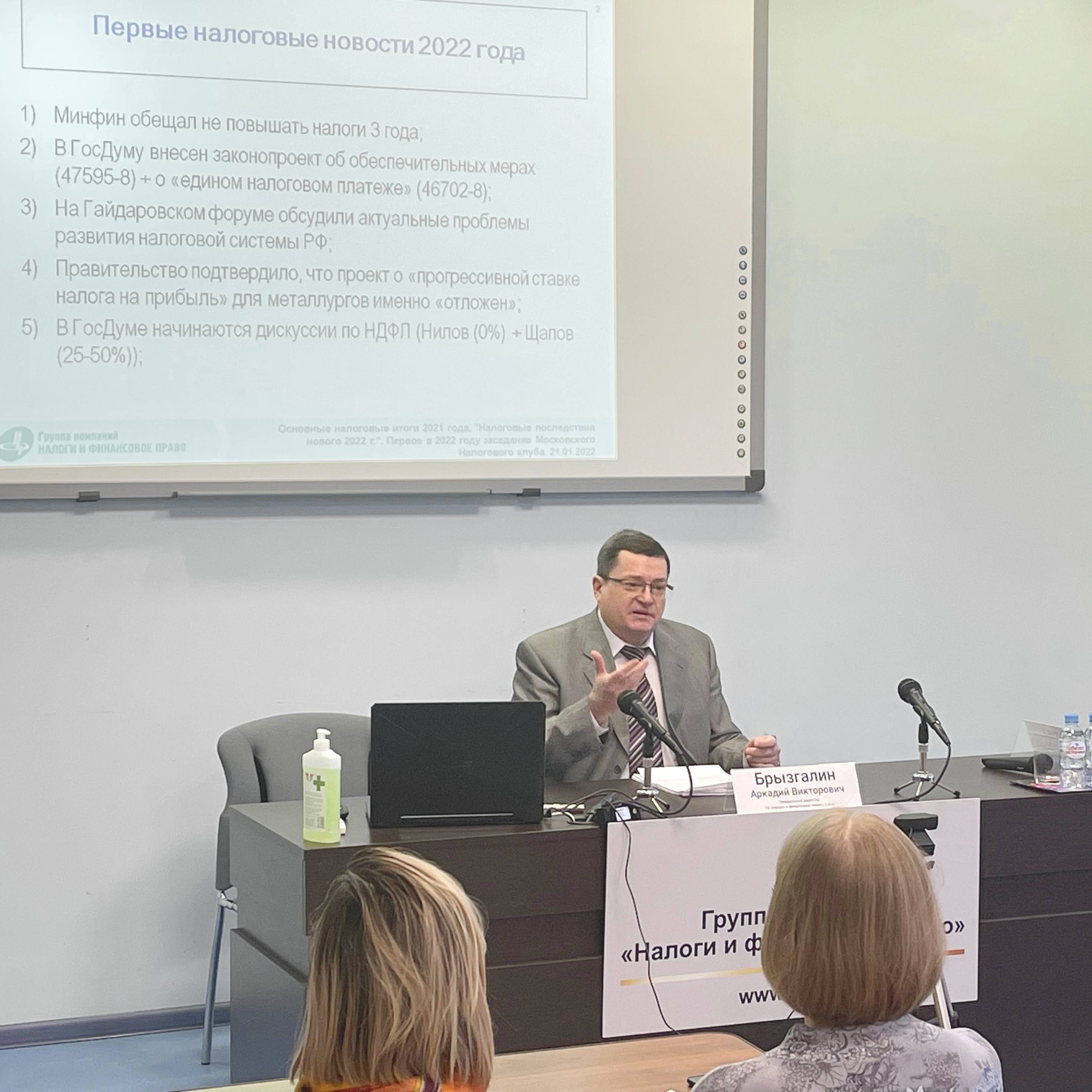 Первое в 2022 году заседание Налогового клуба в Москве подошло к концу. В эпоху вебинаров и онлайн-встреч так приятно было видеть в нашем уютном конференц-зале на проспекте Мира участников заседания. Живое общение в наши дни – редкое явление. Мы его очень ценим.По традиции открыл заседание руководитель ГК «Налоги и финансовое право» Аркадий Викторович Брызгалин. В начале своего выступления Аркадий Викторович сделал сжатый анализ важнейших «налоговых» событий 2021 года, а затем поделился «налоговыми ожиданиями» от наступившего 2022 года, а также кратко напомнил сроках давности, которые истекли 1 января 2022 года (давность взыскания недоимки, давность применения налоговой ответственности, давность назначения выездных налоговых проверок, сроки хранения документов и т.д.).