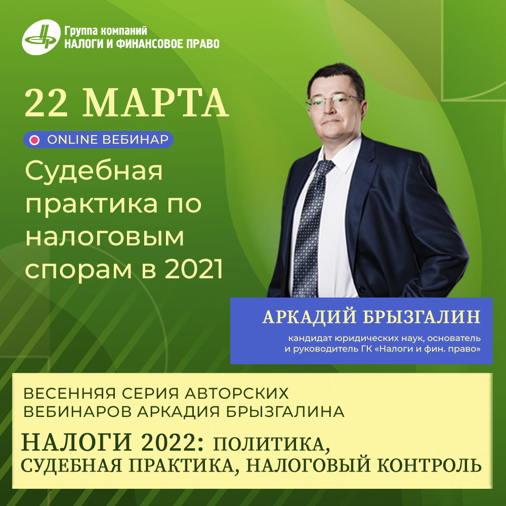 Друзья, завтра 22 марта в 10.00 (МСК), в рамках своей весенней серии Аркадий Викторович Брызгалин сделает максимально полный разбор судебной практики по налоговым спорам за 2021 год. Эксперт рассмотрит более 100 конкретных судебных решений по применению налогового законодательства.