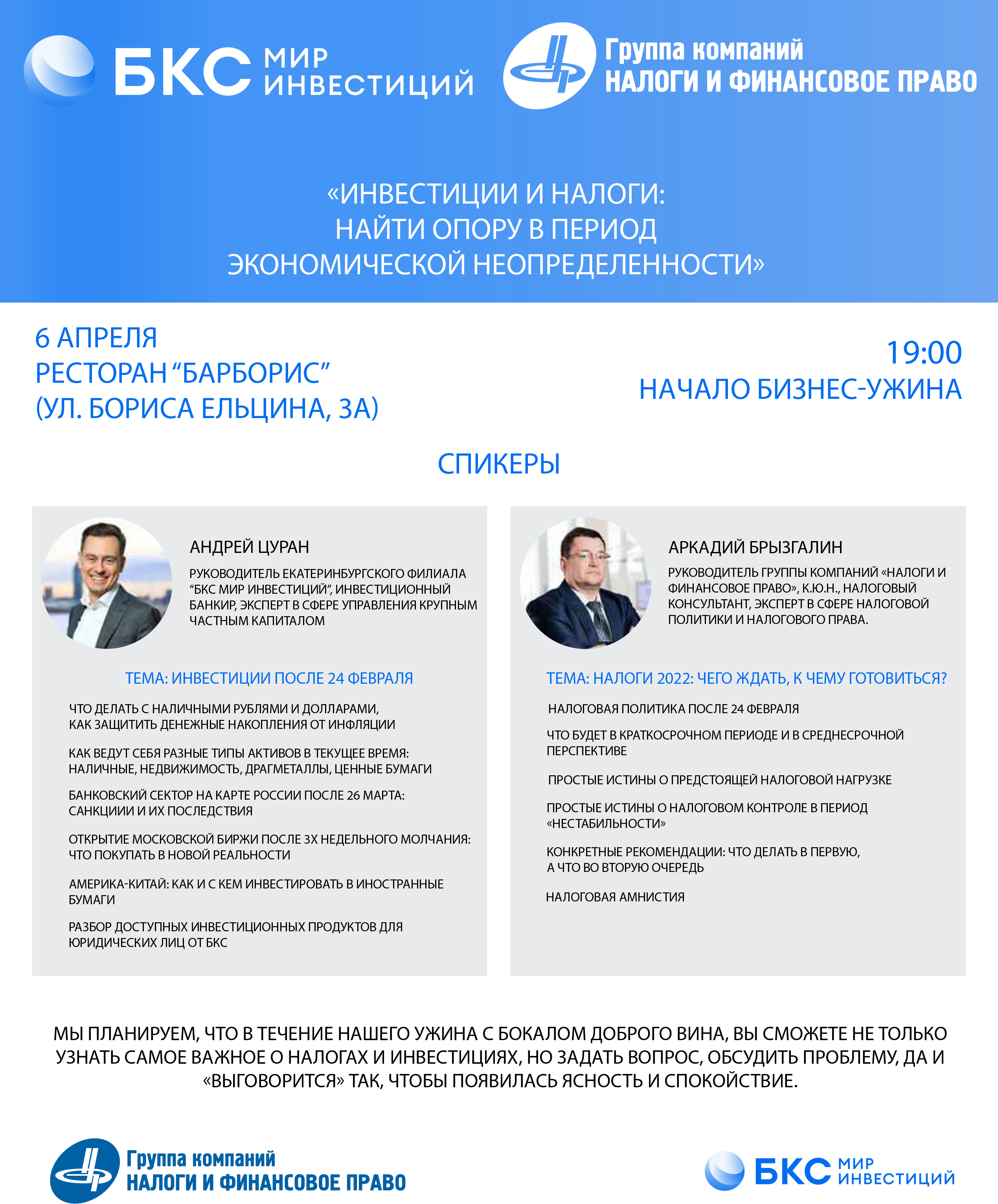 Приглашаем на бизнес-ужин Инвестиции и налоги: найти опору в период экономической неопределенности!