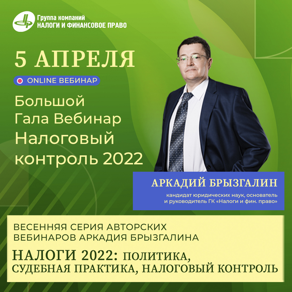 Друзья, завтра 5 апреля в 10.00 (МСК), в рамках своей весенней серии Аркадий Викторович Брызгалин вместе с коллегами проведет Большой Гала-вебинар Налоговый контроль в пост-ковидный период. Налоговый контроль 2022. Вебинар продлится 6 часов.