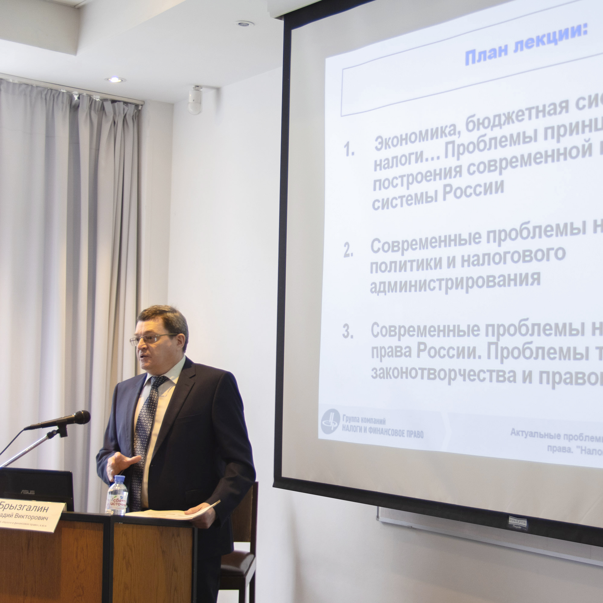 В рамках мероприятия руководитель ГК «Налоги и финансовое право» Аркадий Викторович Брызгалин сделал полный обзор актуальных проблем налоговой политики и налогового права современной России.