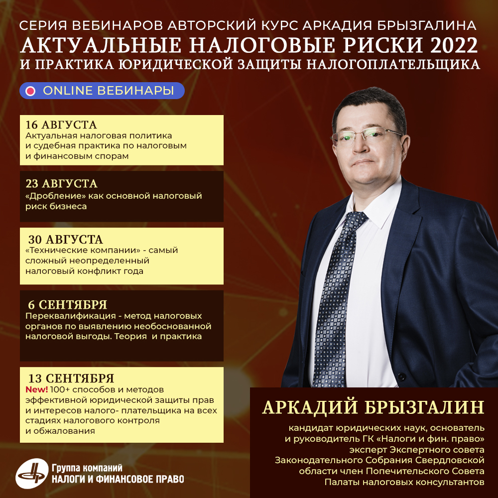 Признанный эксперт-налоговед и команда высококлассных специалистов раскроют самые актуальные налоговые риски 2022 года, а также поделятся рабочими инструментами юридической защиты в налоговых спорах.