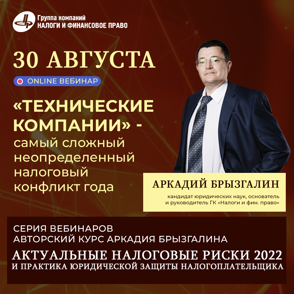 Завтра 30 августа в 10.00 (МСК), в рамках своей серии Аркадий Викторович Брызгалин проведет вебинар: «Технические компании» как самый сложный и самый неопределенный налоговый конфликт 2022 года.На вебинаре разберем: