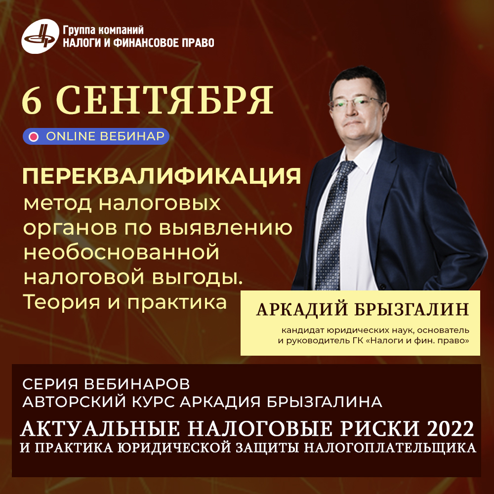 Завтра 6 сентября в 10.00 (МСК), в рамках своей серии Аркадий Викторович Брызгалин проведет вебинар: «Переквалификация как «креативный» метод налоговых органов по выявлению необоснованной налоговой выгоды: теоретические и практические аспекты».Вебинар состоит из ТРЕХ частей: