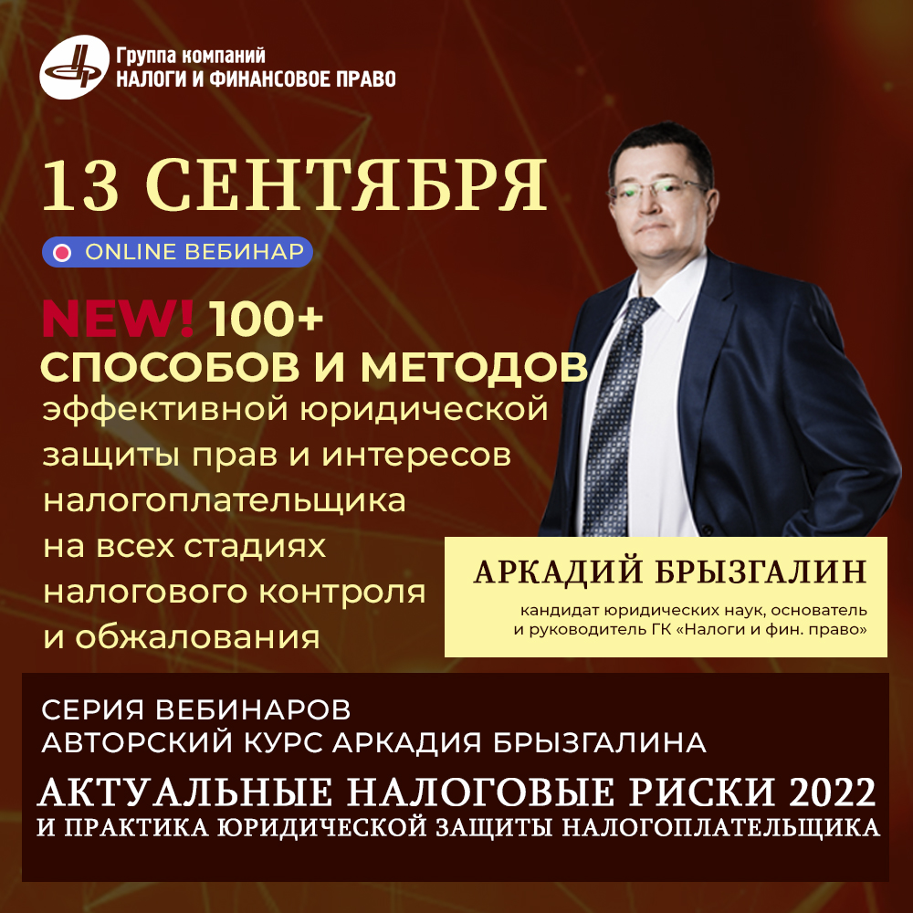 Завтра 13 сентября в 10.00 (МСК), в рамках своей серии Аркадий Викторович Брызгалин проведет заключительный вебинар серии: «100 способов и методов эффективной юридической защиты прав и интересов налогоплательщика на всех стадиях налогового контроля и обжалования. От профилактики налоговой безопасности до обращения в Конституционный Суд». Вебинар проводится впервые!На вебинаре разберем: