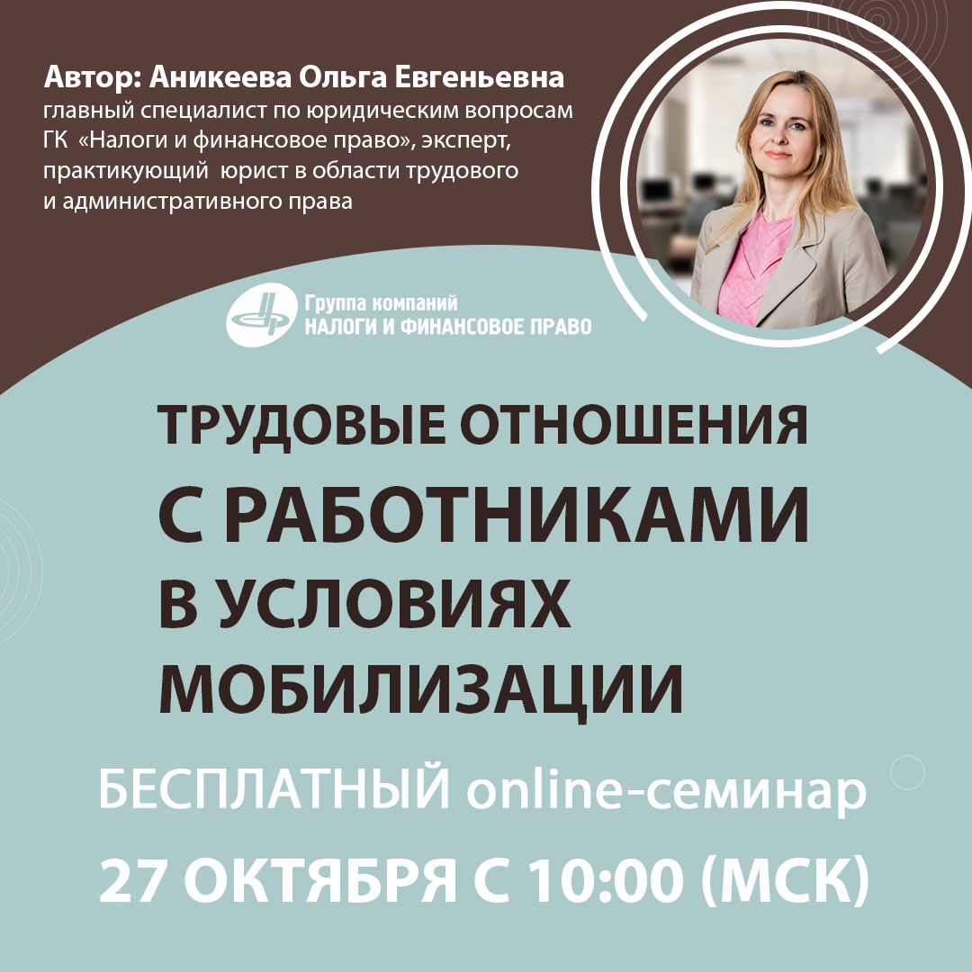Лектор: Аникеева Ольга Евгеньевна - главный специалист по юридическим вопросам ГК «Налоги и финансовое право», эксперт, практикующий юрист в области трудового и административного права.