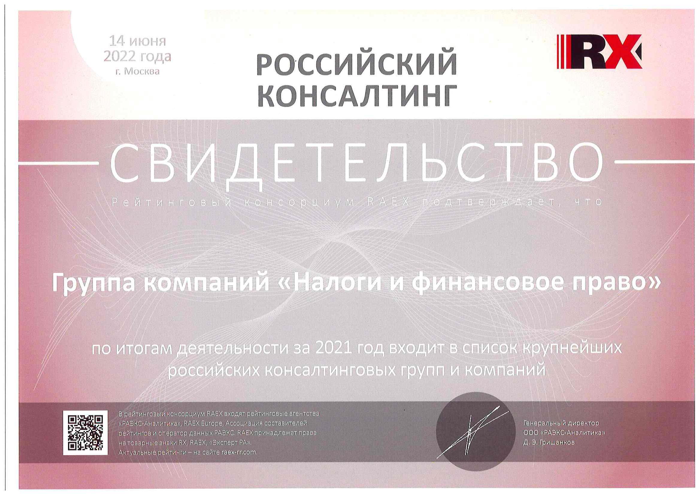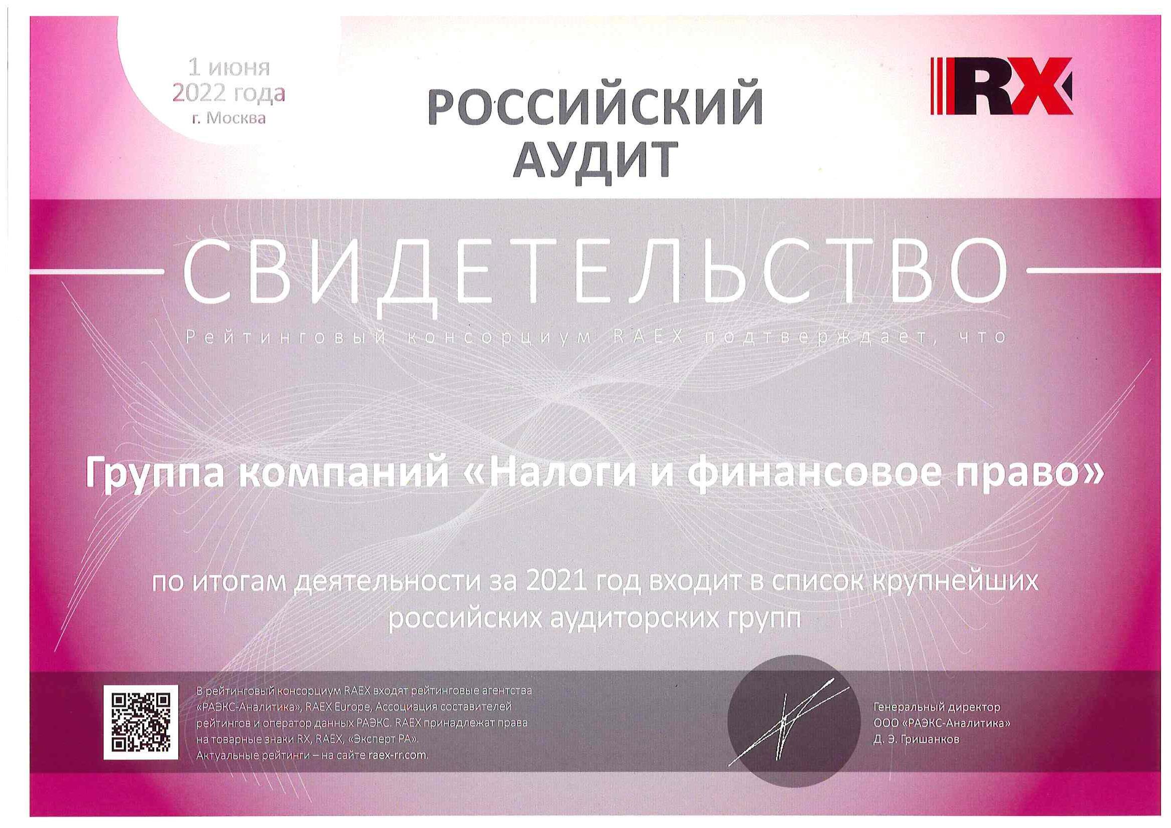 По итогам деятельности за 2021 год Группа компаний «Налоги и финансовое право» входит в список крупнейших российских аудиторских и консалтинговых организаций.