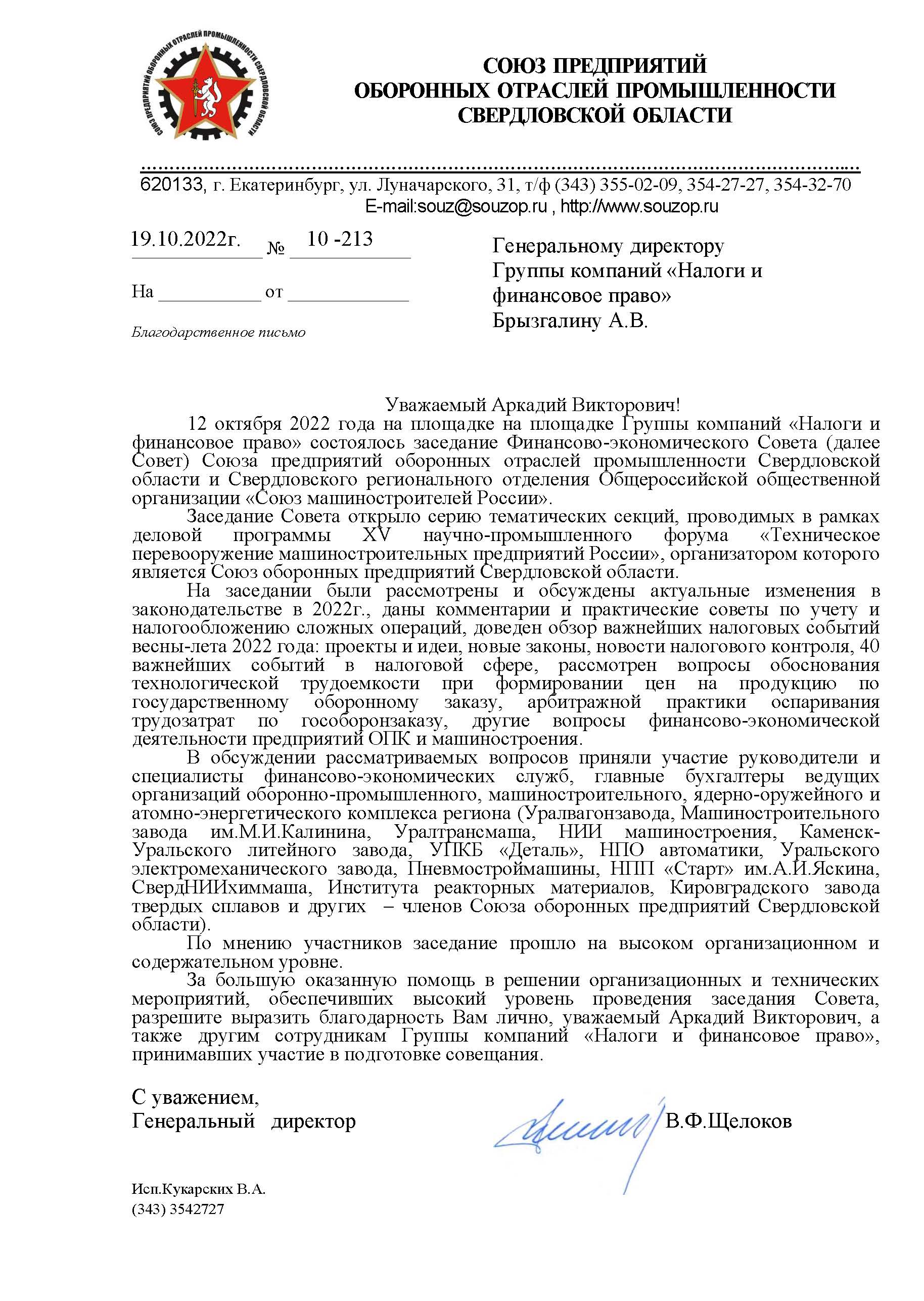 ГК «Налоги и финансовое право» гордится многолетним сотрудничеством с Союзом оборонных предприятий, а также тем, что участвует в организации заседания финансово-экономического совета и благодарит руководителей Союза за столь высокую оценку.