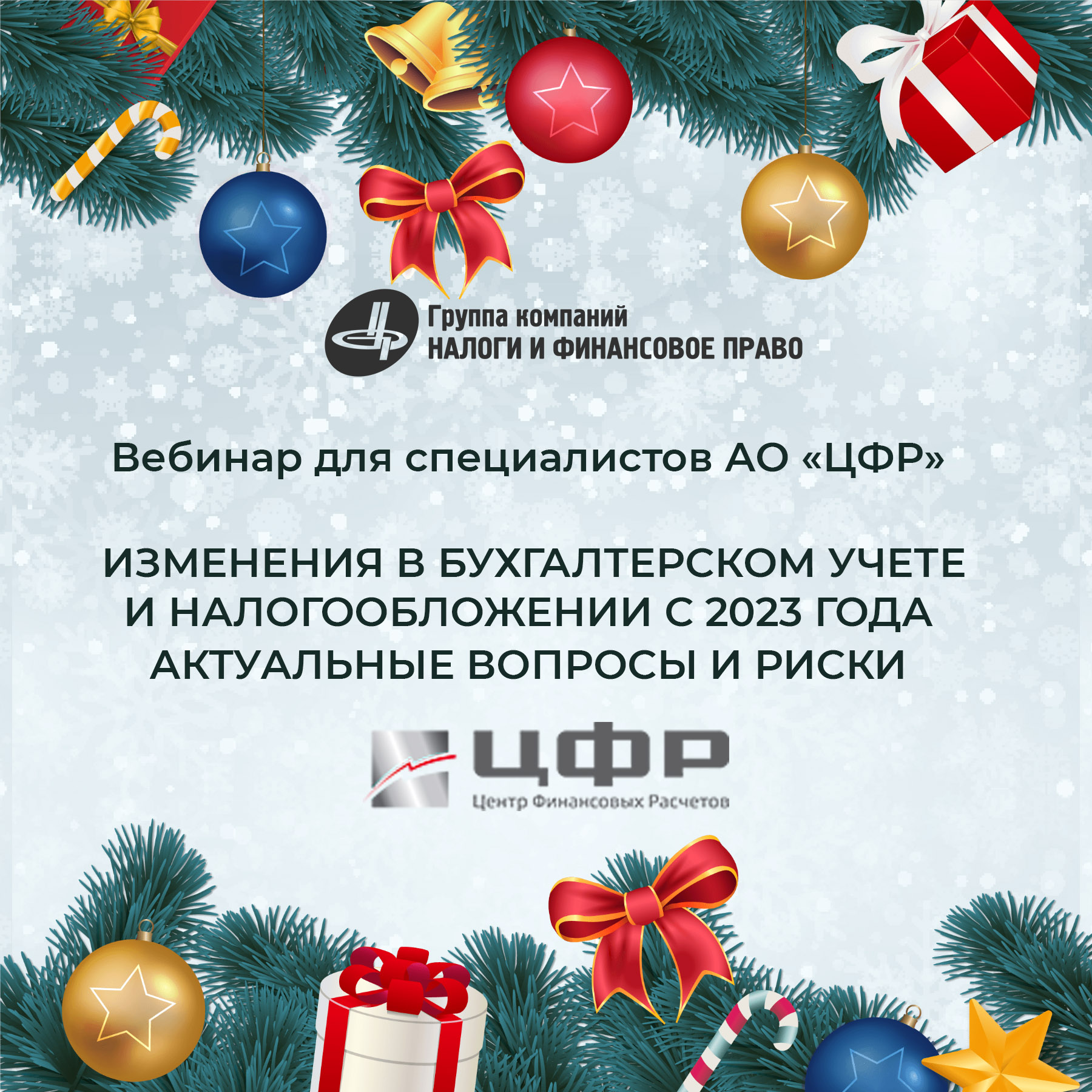 В середине декабря специалисты ГК «Налоги и финансовое право» организовали и провели вебинар «Изменения в бухгалтерском учете и налогообложении с 2023 года. Актуальные вопросы и риски» для специалистов АО «ЦФР» - наших давних партнеров.Квартет экспертов ГК «Налоги и финансовое право»: Ольга Федорова, Ольга Харалгина, Ольга Аникеева и Лилия Набиуллина подробно рассказали об актуальных изменениях налогового законодательства в части НДС и налога на прибыль, новых ФСБУ и свежих изменениях в ТК РФ, в исчислении НДФЛ и страховых взносов. Не обошли стороной сложные вопросы и порядок перехода на единый налоговый счет и единый налоговый платеж.