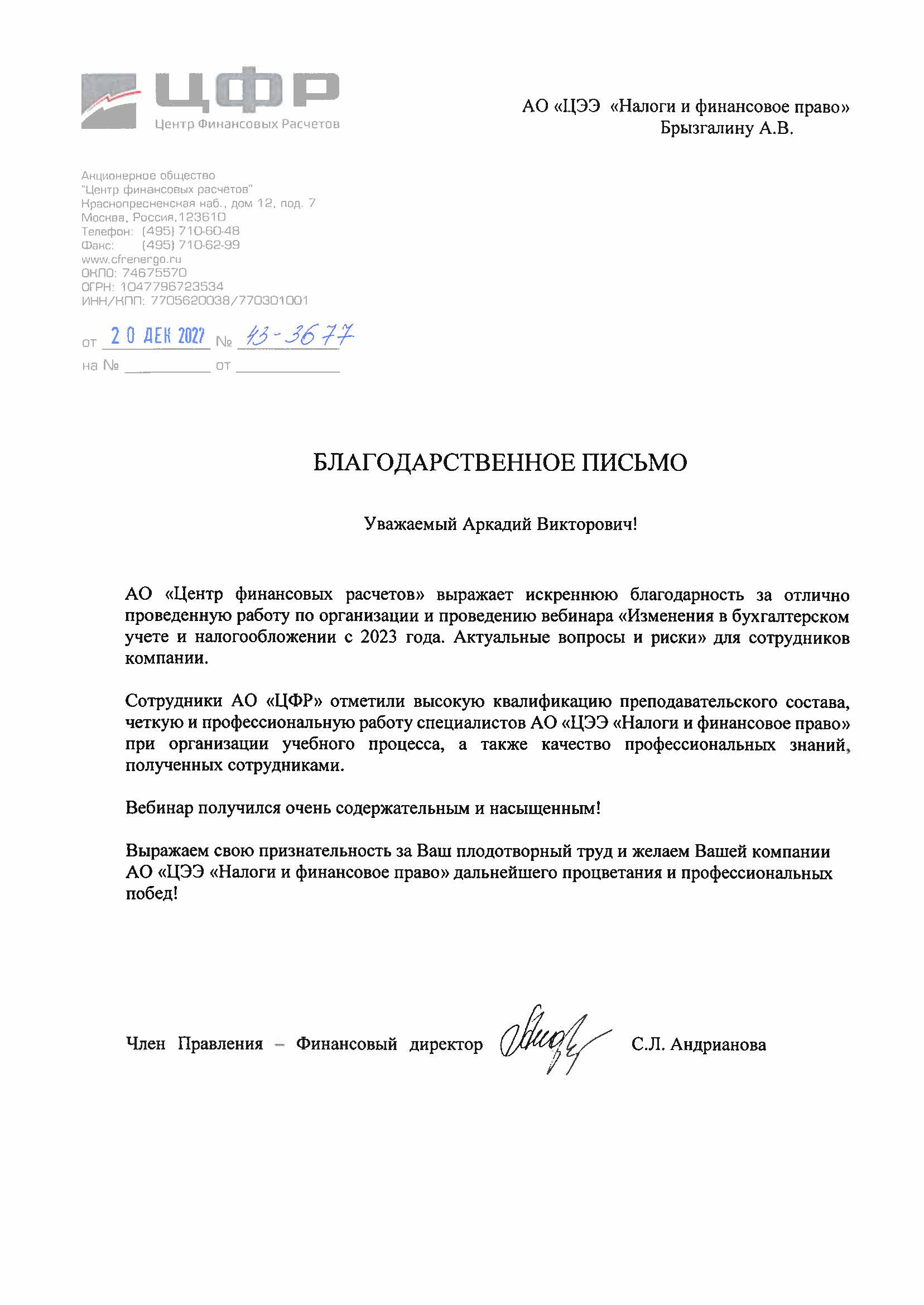 Благодарим АО «Центр Финансовых расчетов» за отзыв о вебинаре и высокую оценку квалификации наших специалистов. Желаем компании процветания и надеемся на дальнейшее сотрудничество.