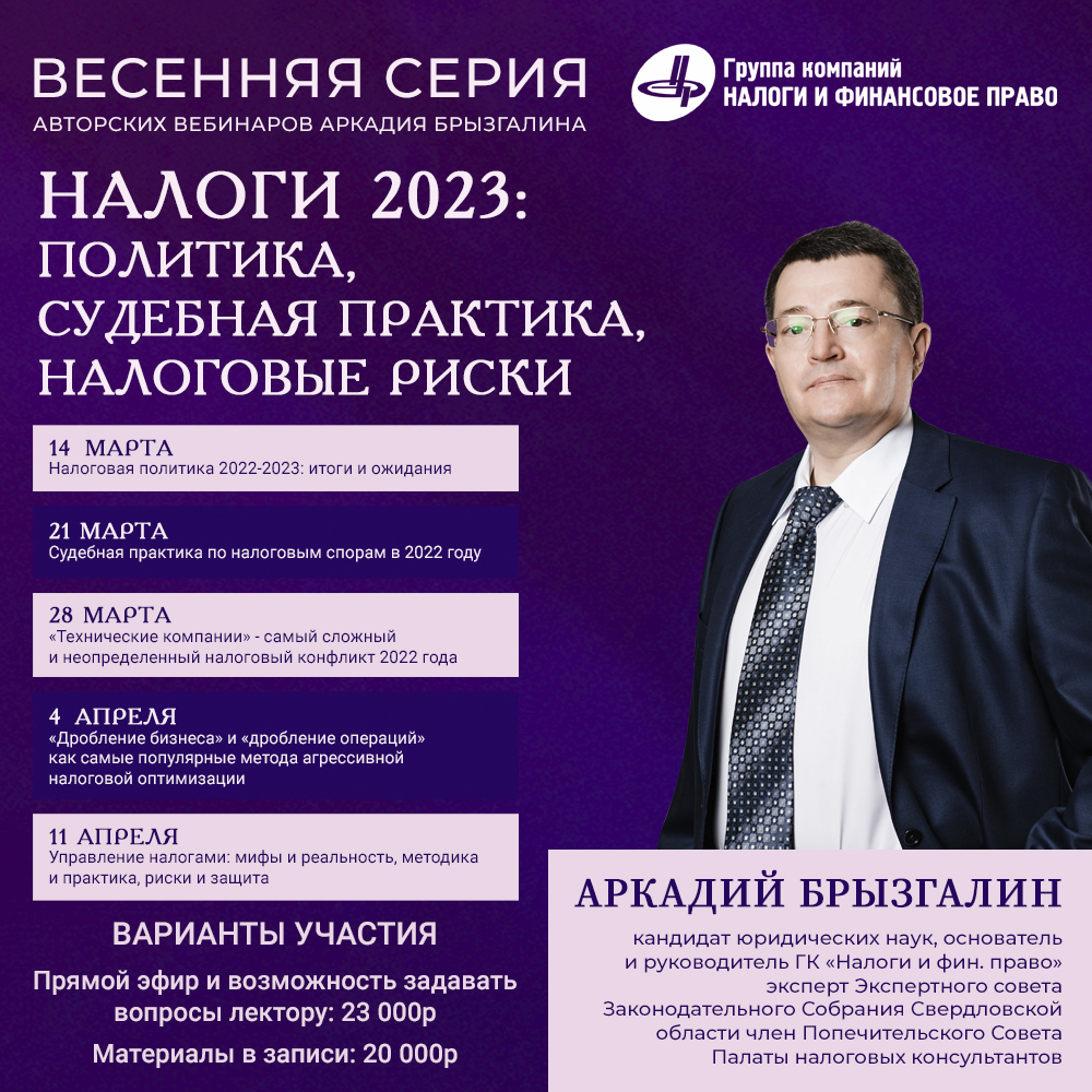 Неизменная ценность нашего времени - выверенная и четко структурированная информация в важных для бизнеса вопросах налогообложения и управления бизнесом. Именно поэтому 14 марта стартует серия вебинаров: «Налоги 2023: политика, судебная практика, налоговые риски» в которой я собрал темы, которые будут интересны практически для любой отрасли и любой организации, а также для всех, кто связан с уплатой налогов. Я подготовил свежие рекомендации, случаи из собственной практики и практики коллег, инструменты управления налогами, техники аргументации, прецеденты и дела, касающиеся налогов.