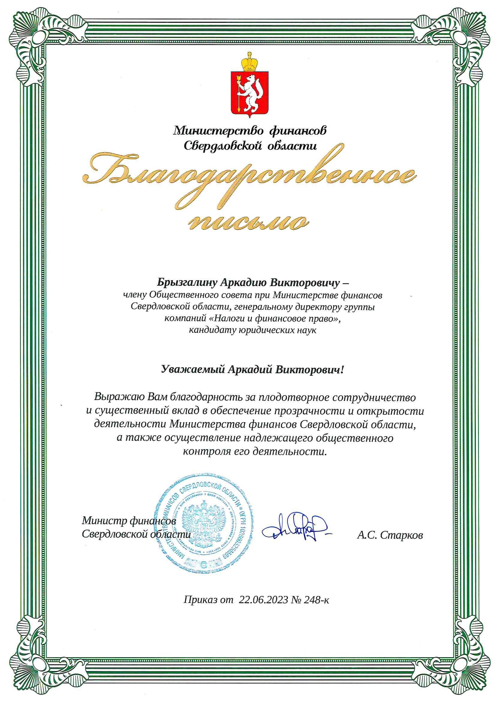 На встрече в знак признательности и высокой оценки деятельности Аркадию Викторовичу было вручено благодарственное письмо (Приказ от 22.06.2023 №248-к) за подписью Министра финансов Александра Сергеевича Старкова.
