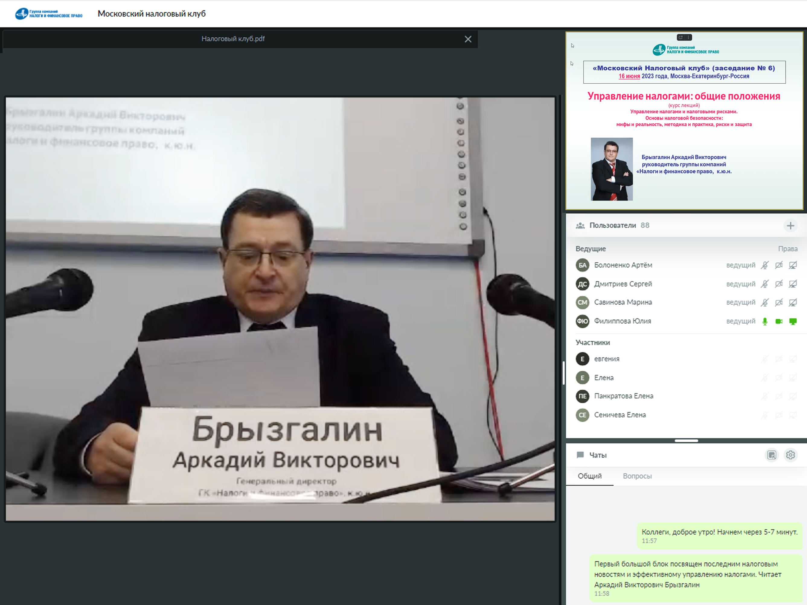 По традиции, заседание открыл руководитель ГК «Налоги и финансовое право» Аркадий Викторович Брызгалин информационным сообщением о событиях российского налогообложения. Далее Аркадий Викторович прочитал вторую, из серии тематических, лекцию об эффективном управлении налогами. Участники заседания выяснили, что такое «налоговая выгода», каких видов она бывает и как её искать, а также как управлять налогам, не выходя за рамки закона.
