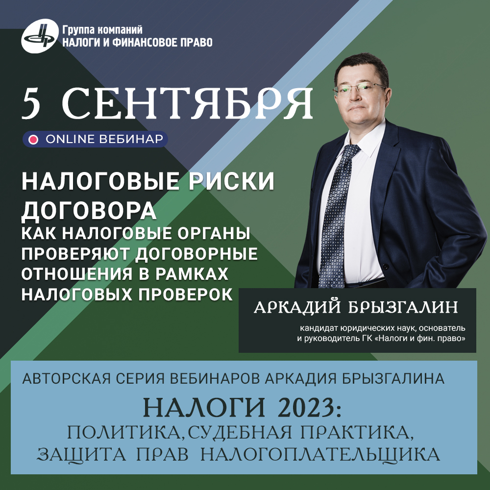 Завтра, 5 сентября, с 10.00 (МСК) на третьем вебинаре серии Аркадия Викторовича Брызгалина Налоги 2023: политика, судебная практика, защита прав и интересов налогоплательщика рассмотрим Налоговые риски договора.