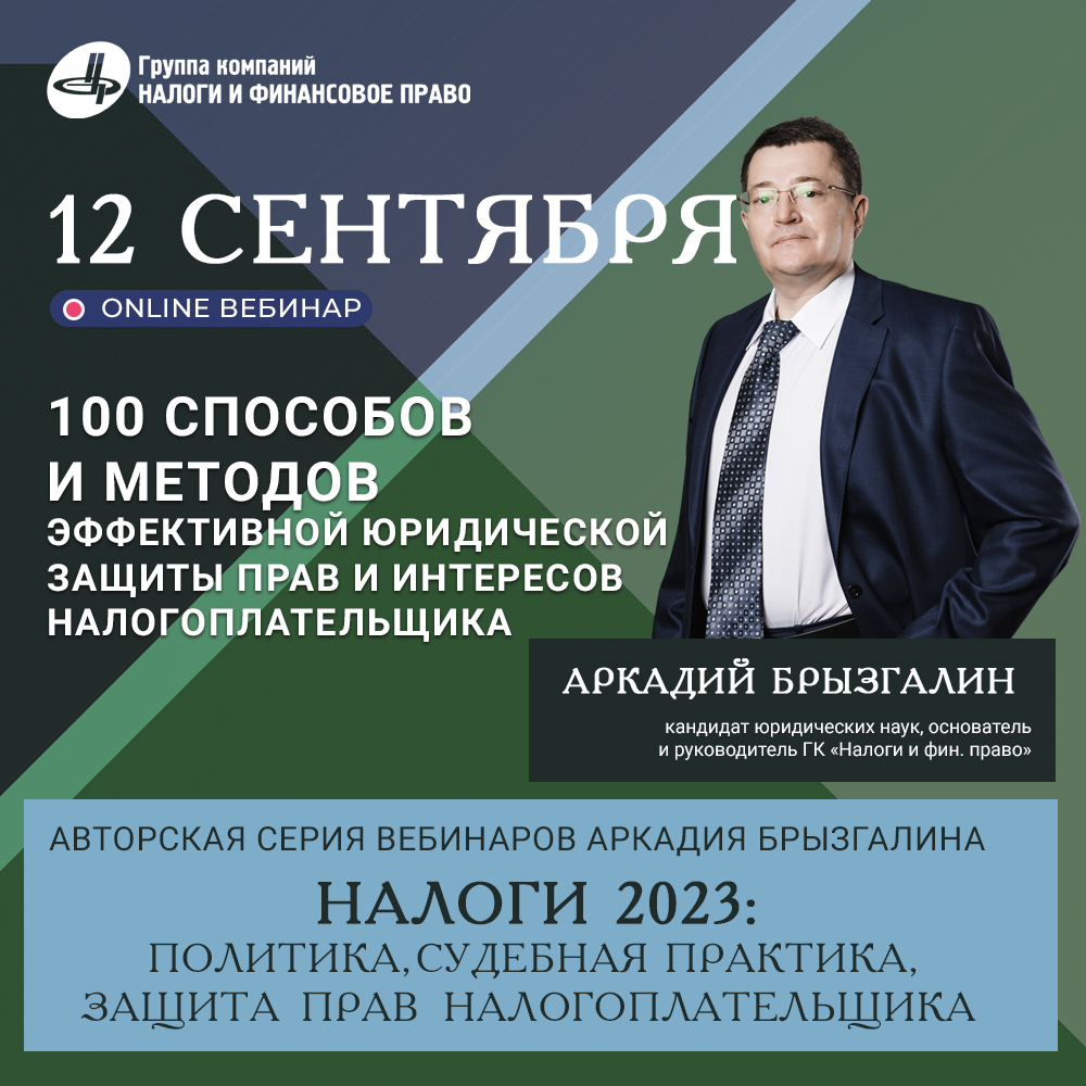 Завтра, 12 сентября, с 10.00 (МСК) на четвертом вебинаре серии Аркадия Викторовича Брызгалина Налоги 2023: политика, судебная практика, защита прав и интересов налогоплательщика рассмотрим 100 способов и методов эффективной юридической защиты прав и интересов налогоплательщика на всех стадиях налогового контроля и обжалования. От профилактики налоговой безопасности до обращения в Конституционный Суд.
