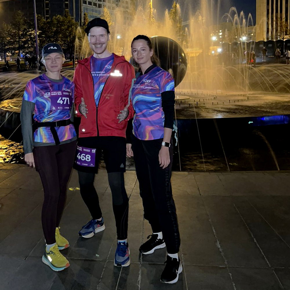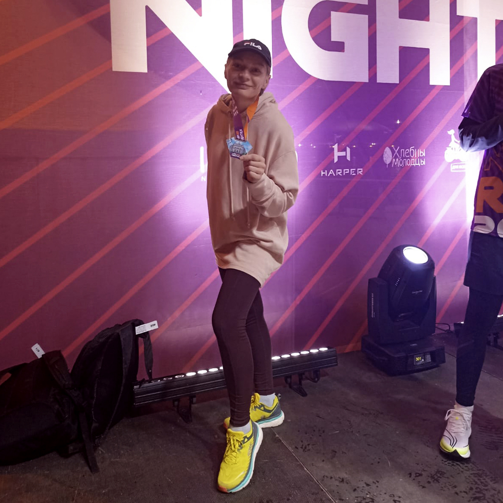 В момент старта на дистанцию в 10 км, когда на город опустился вечер, трасса подсветилась тысячью фонариков и иллюминацией! Эффектное зрелище! Практически вся наша команда бежала 10 км.