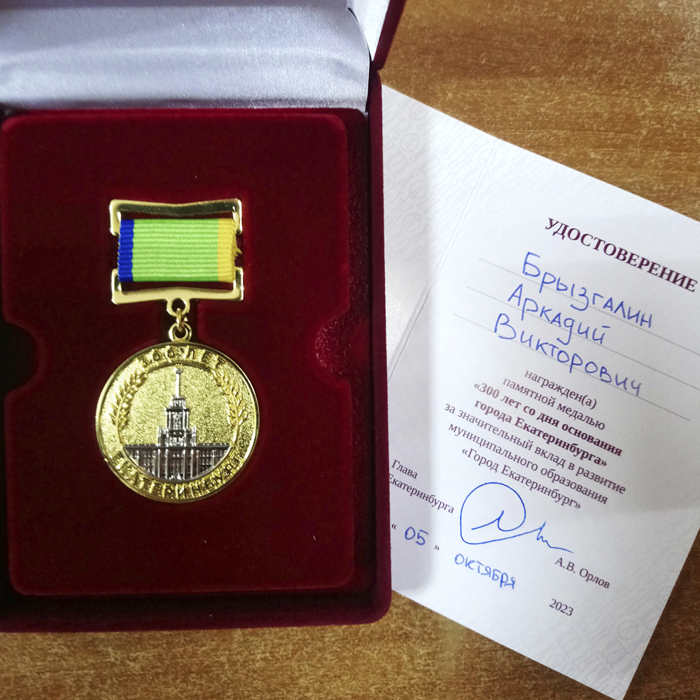 В конце декабря к ценным наградам руководителя ГК «Налоги и финансовое право» Брызгалина Аркадия Викторовича добавилась еще одна: памятная медаль «300 лет со дня основания города Екатеринбурга». Это особый знак за значительный вклад в развитие муниципального образования «Город Екатеринбург».