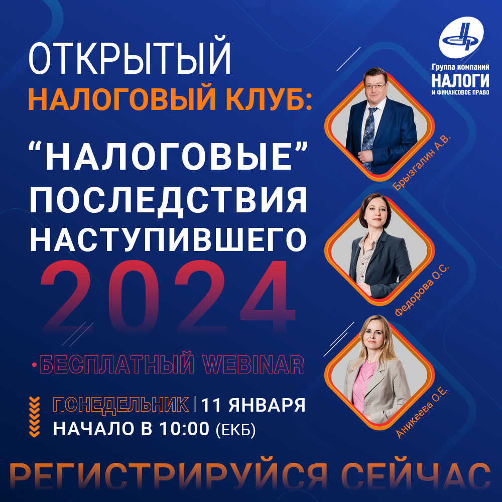 Друзья, по нашей давней традиции, самое первое в новом году заседание Налогового клуба мы посвящаем «Налоговым» последствиям наступившего 2024 года, проводим абсолютно БЕСПЛАТНО и для всех желающих.
