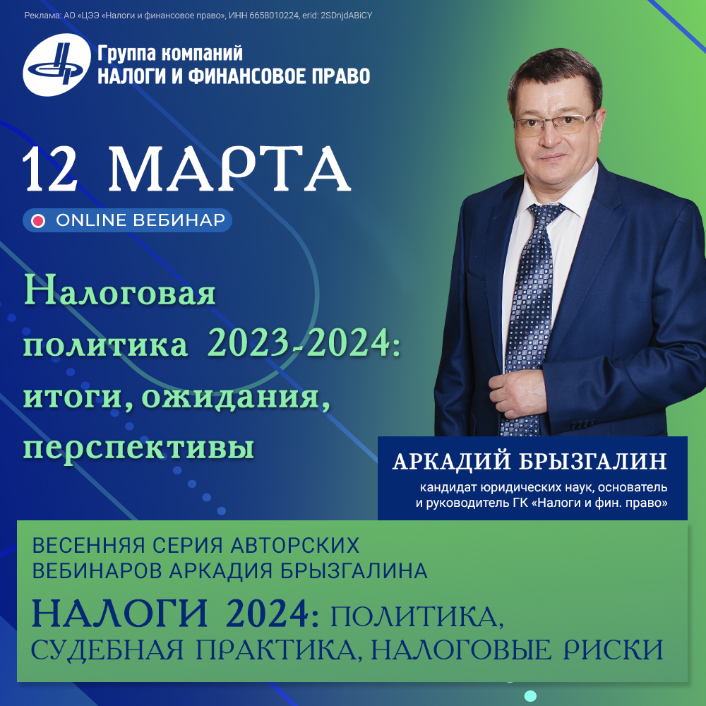 Друзья, уже завтра стартует наш первый вебинар авторской серии Аркадия Викторовича Брызгалина «Налоги 2024: политика, налоговый контроль и судебная практика»