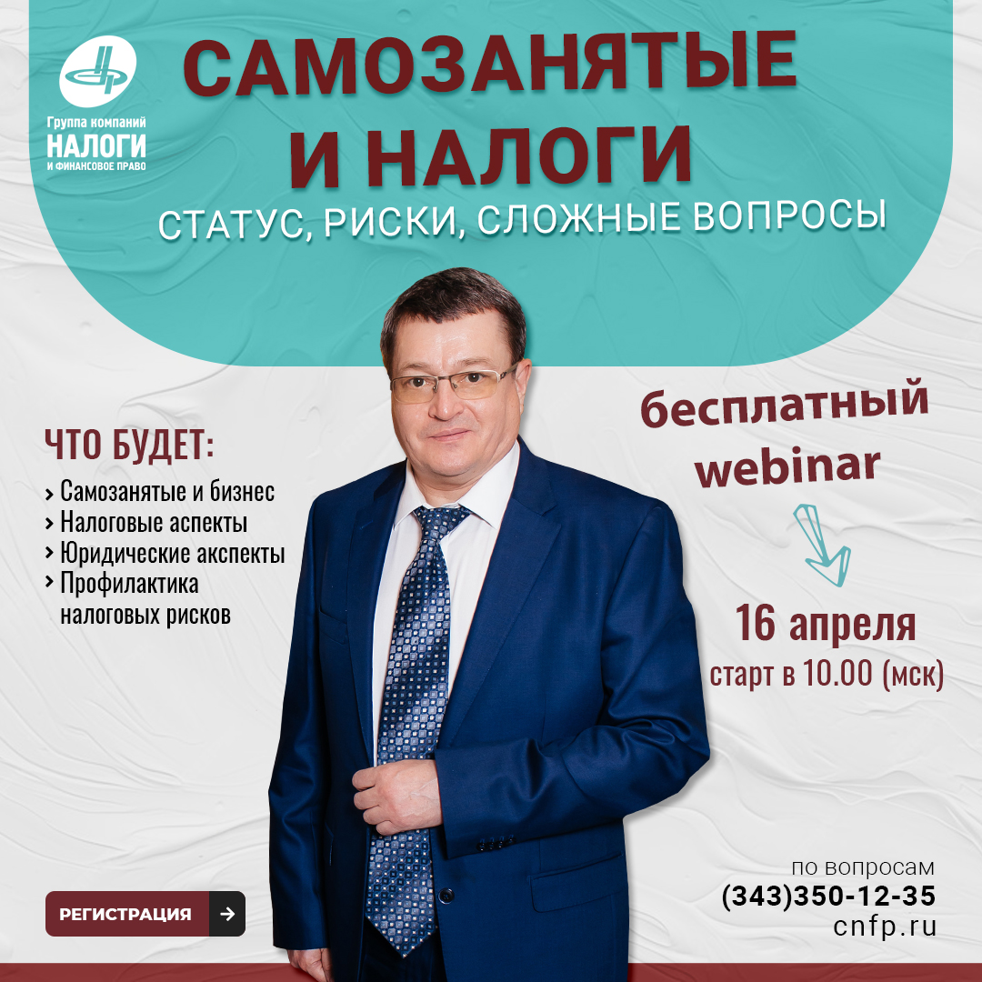 Уже завтра, 16 апреля в 10.00 (МСК) пройдет открытый вебинар: «Самозанятые» и налоги: статус, риски, сложные вопросы, который автор, руководитель ГК «Налоги и финансовое право» Аркадий Викторович Брызгалин посвящает рассмотрению сложных налоговых и юридических вопросов для всех самозанятых, а также всех тех, кто работает с самозанятыми.