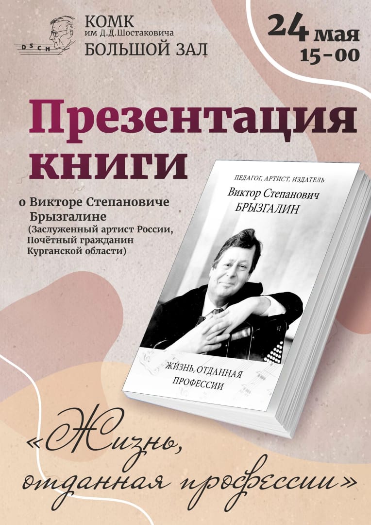 24 мая в Кургане запланирована презентация книги «Жизнь, отданная профессии», посвященная Заслуженному артисту России и Почетному гражданину Курганской области Виктору Степановичу Брызгалину. Мероприятие станет данью уважения и памяти выдающемуся педагогу, музыканту и творцу.