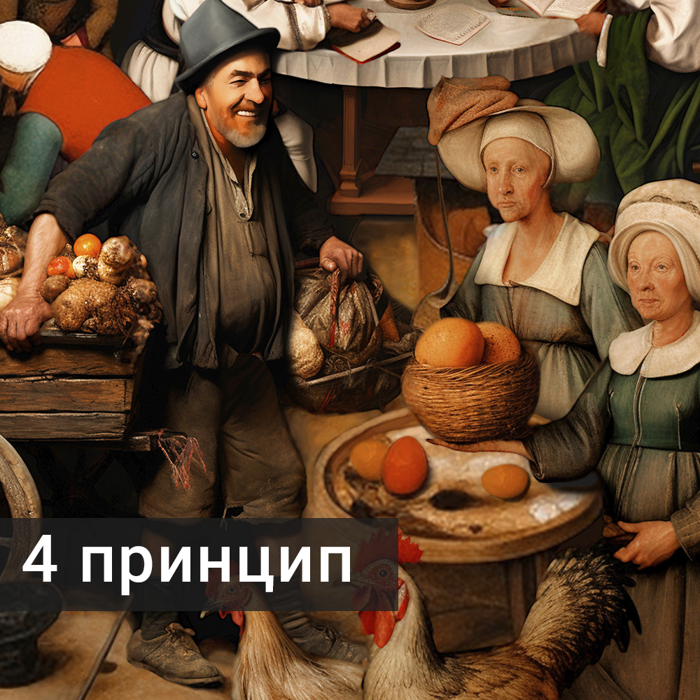 4-тый принцип «Возможность и способность»: Крупный торговец везет повозку с продовольствием. Нищие несут по одному яйцу. Согласно этому принципу, каждый должен иметь возможность, способность к уплате налогов. При установлении налогов учитывается фактическая способность налогоплательщика к уплате налога.