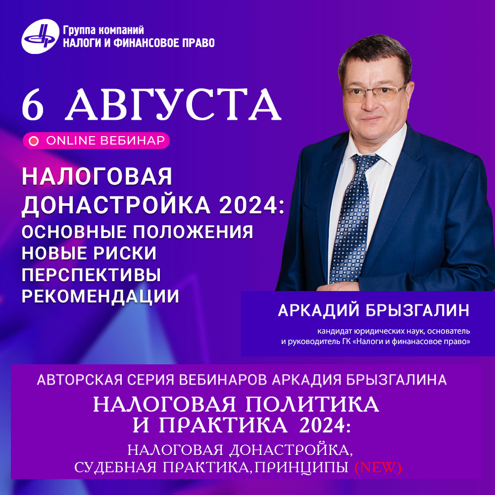 Коллеги, уже завтра стартует летняя серия авторских вебинаров А.В. Брызгалина: Налоговая политика и практика 2024: налоговая донастройка, судебная практика, принципы.