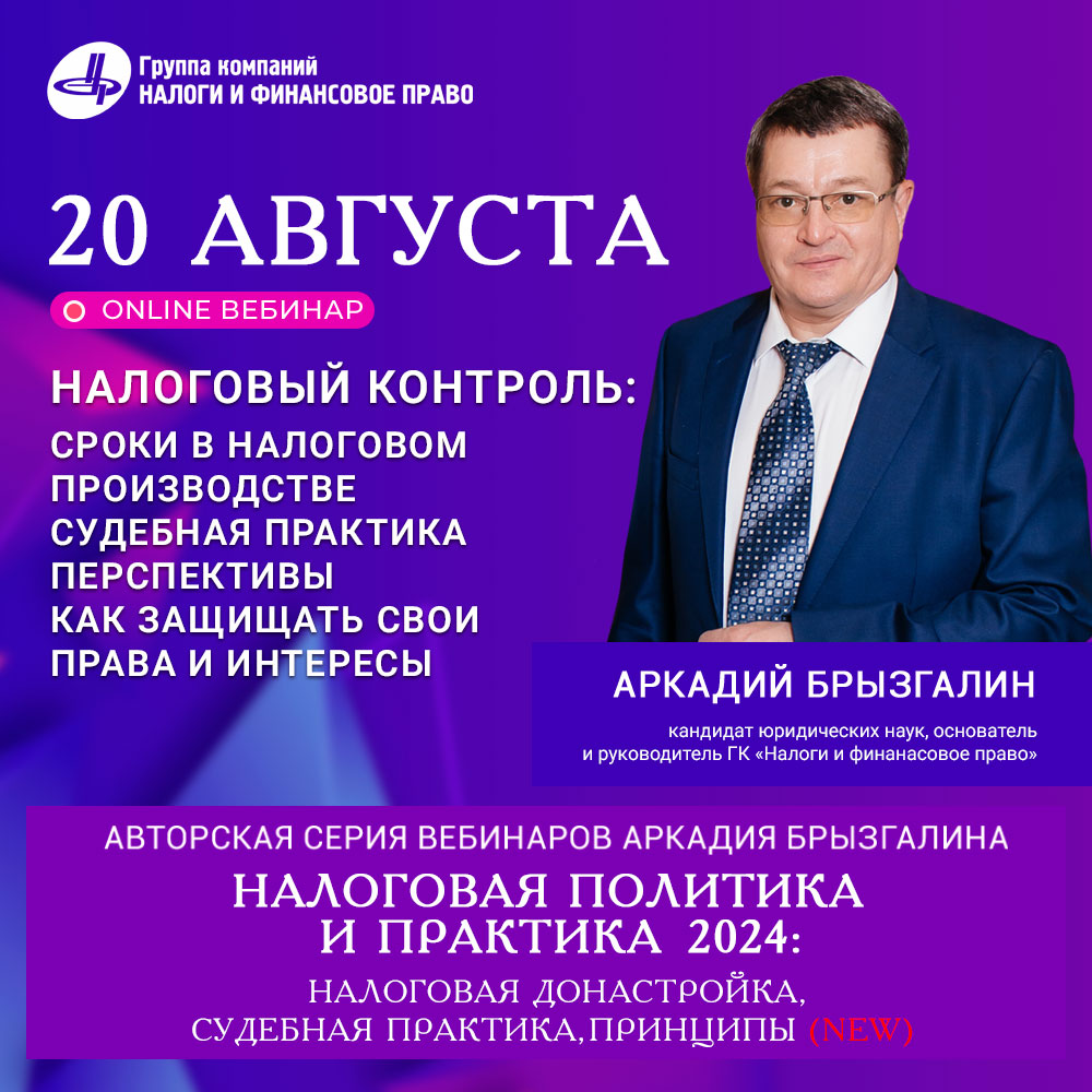 Третий день летней серии авторских вебинаров А.В. Брызгалина: Налоговая политика и практика 2024: налоговая донастройка, судебная практика, принципы автор посвятит налоговому контролю, срокам в налоговом производстве, расскажет о том, как подготовиться к налоговой проверке и защитить свои интересы.