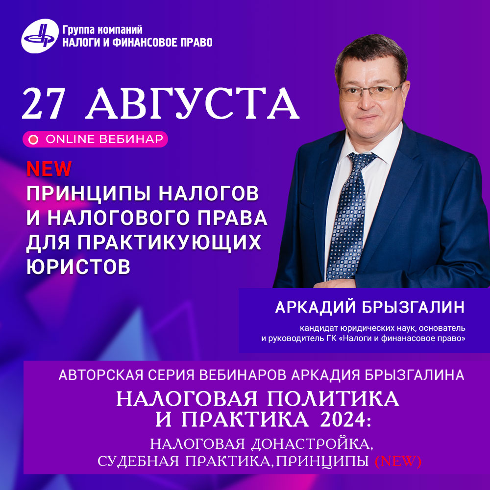 Четвертый день летней серии авторских вебинаров А.В. Брызгалина: Налоговая политика и практика 2024: налоговая донастройка, судебная практика, принципы автор посвятит принципам налогов и налогового права для практикующих юристов.
